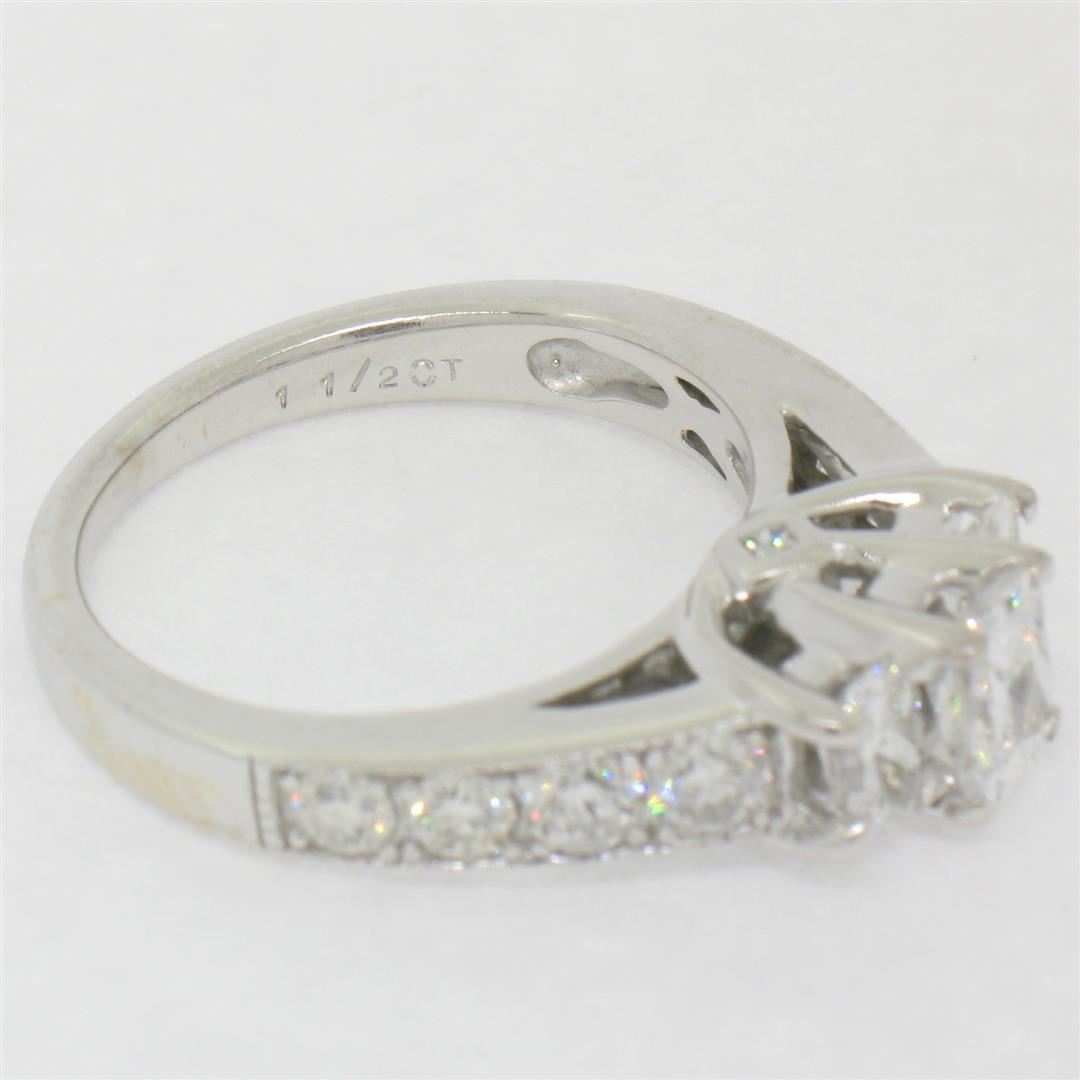 A solid 14k white gold engagement ring, with 3 radiant cut natural diamonds (F/G - VS1/VS2 ; 0.92ctw), and 8 round brilliant cut natural diamonds (F/G - VS1/VS2 ; 0.56ctw), with 2 princess cut natural diamonds (F/G - VS1/VS2 ; 0.02ctw). The ring is size