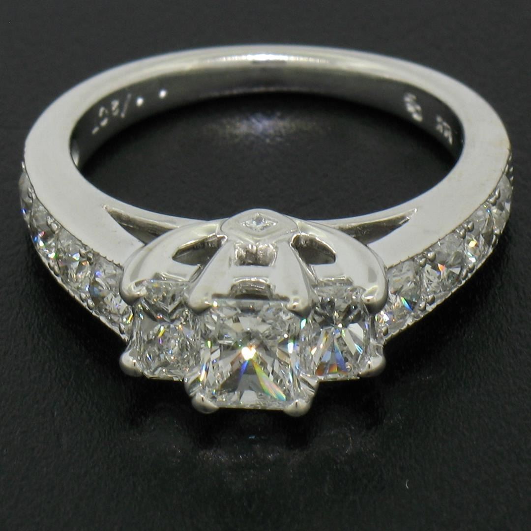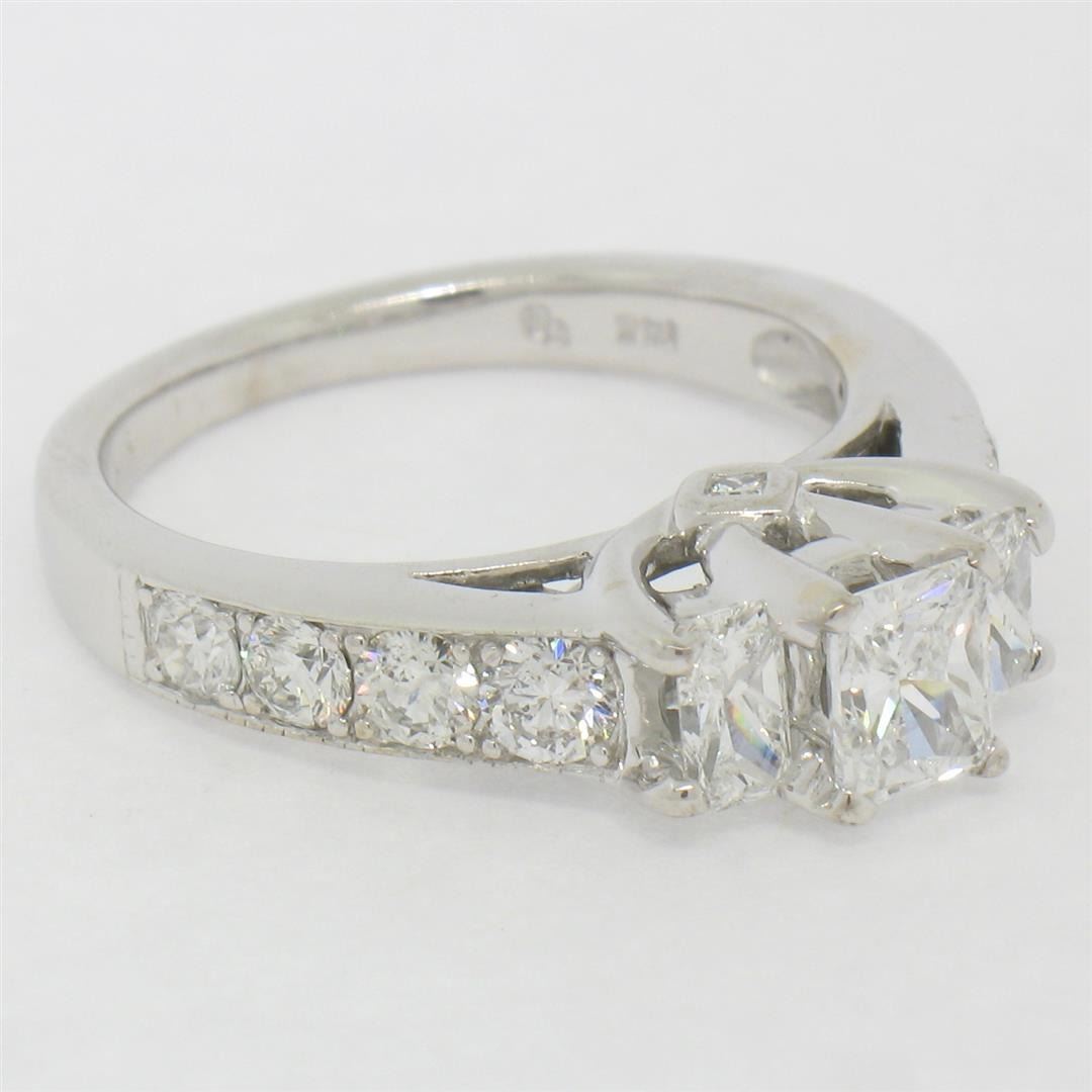 A solid 14k white gold engagement ring, with 3 radiant cut natural diamonds (F/G - VS1/VS2 ; 0.92ctw), and 8 round brilliant cut natural diamonds (F/G - VS1/VS2 ; 0.56ctw), with 2 princess cut natural diamonds (F/G - VS1/VS2 ; 0.02ctw). The ring is size