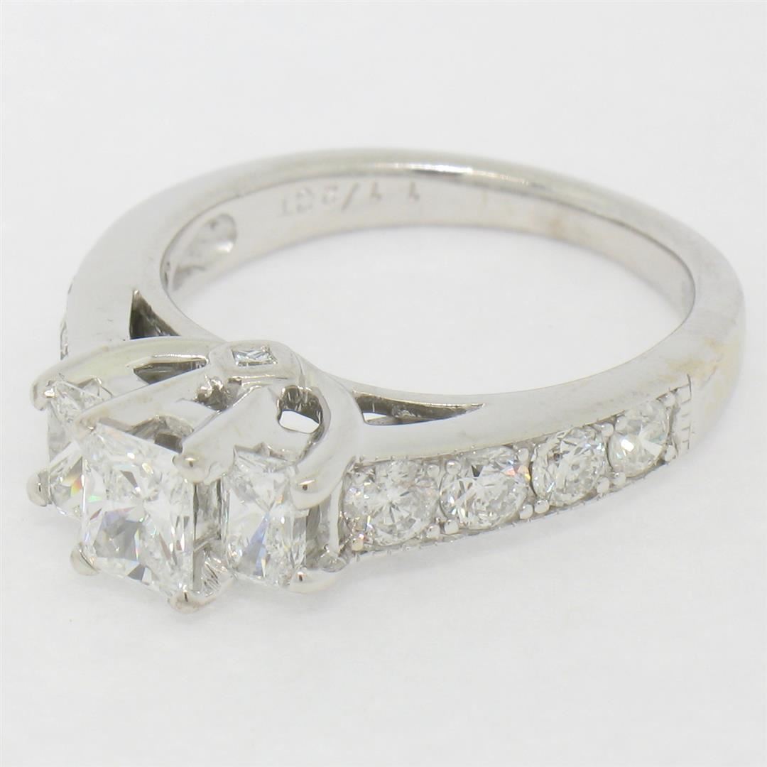 A solid 14k white gold engagement ring, with 3 radiant cut natural diamonds (F/G - VS1/VS2 ; 0.92ctw), and 8 round brilliant cut natural diamonds (F/G - VS1/VS2 ; 0.56ctw), with 2 princess cut natural diamonds (F/G - VS1/VS2 ; 0.02ctw). The ring is size 5.5, weighs a total of 4.72 grams, and measures 5.65mm wide.