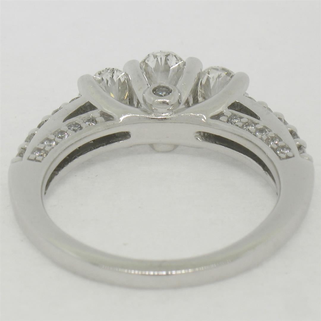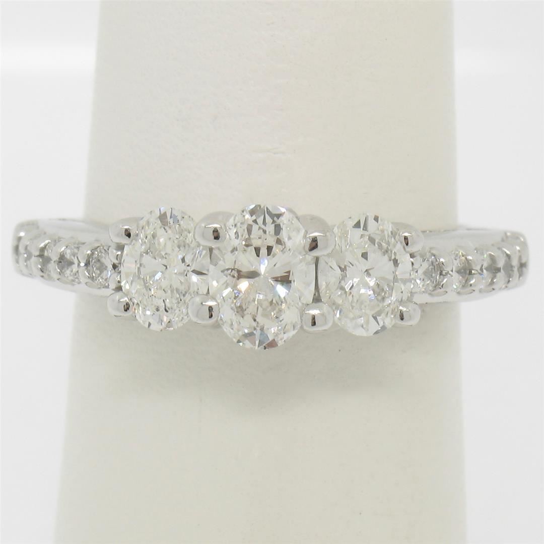 An estate solid 14k white gold ring, with 3 oval cut natural diamonds (H- SI1/SI2; 1.19ctw), accented with 32 round brilliant cut natural diamond (H/I- SI1/SI2; 0.31ctw). The ring is size 6.0, weighs a total of 4.97 grams, and measures 6.0mm wide.