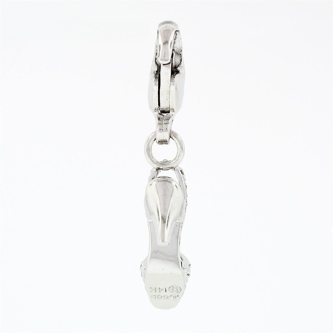 A solid 14k white gold high heel shoe charm pendant, with 15 round brilliant cut natural diamonds (G/H - SI1/SI2; 0.15ctw). The pendant weighs a total of 1.62 grams, measures 26.52x4.75mm including the bail, and the inside of the bail measures 3.8mm.