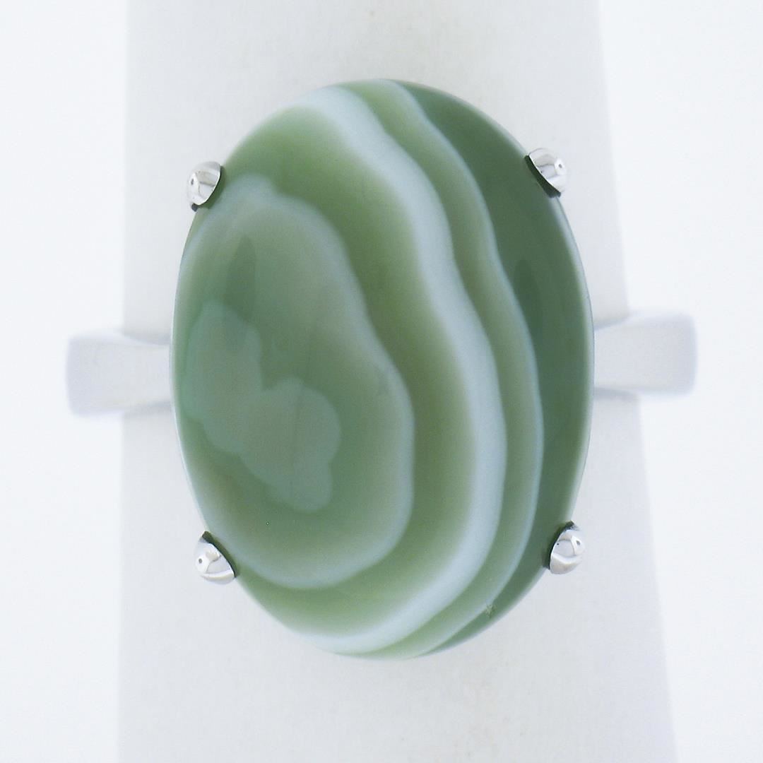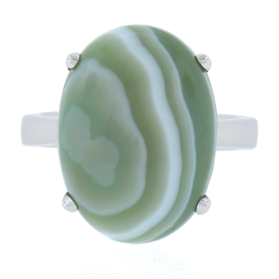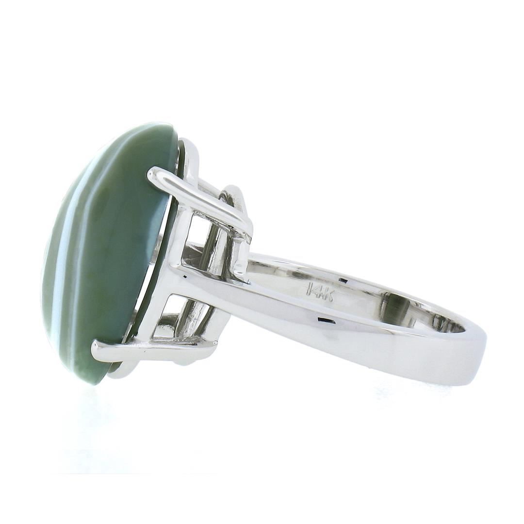 A solid 14k white gold ring, with 1 oval cabochon cut natural agate (18x13.2mm). The ring is size 6.5, weighs a total of 7.76 grams, and measures 18mm wide.