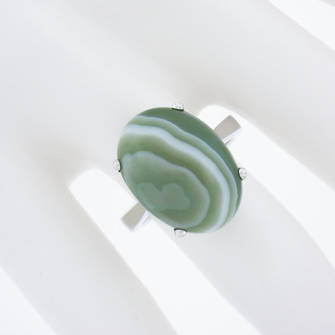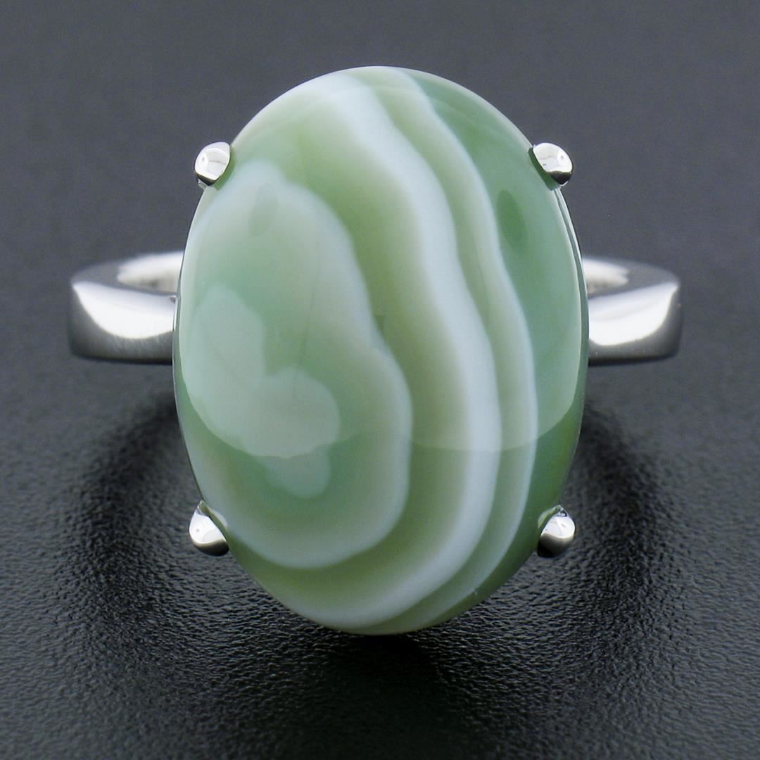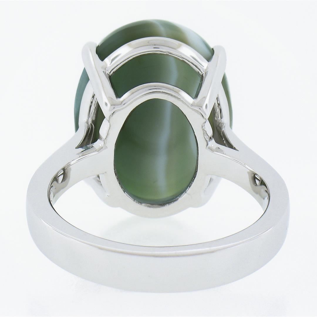 A solid 14k white gold ring, with 1 oval cabochon cut natural agate (18x13.2mm). The ring is size 6.5, weighs a total of 7.76 grams, and measures 18mm wide.