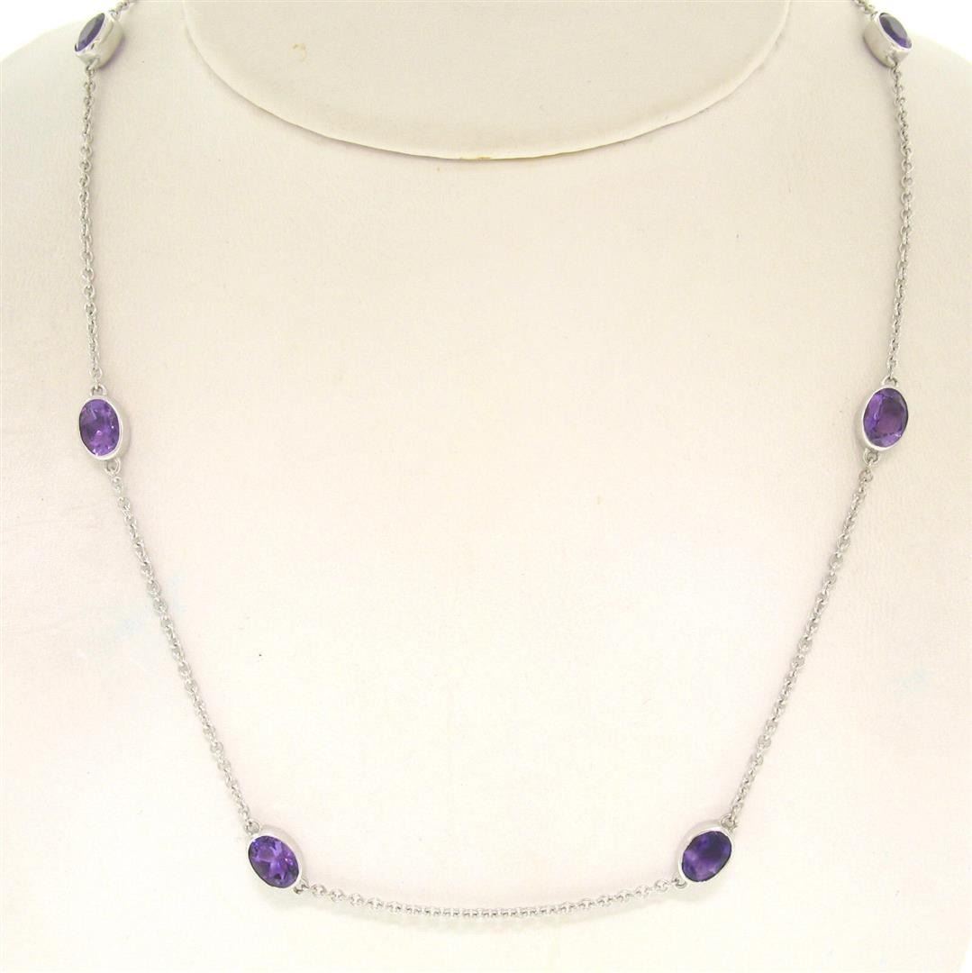 A new solid 14k white gold by the yard necklace, with 18 oval cut natural amethysts (19.72ctw). It weighs a total of 19.20 grams, measures 5.91mm wide, and measures 38 inches in length.