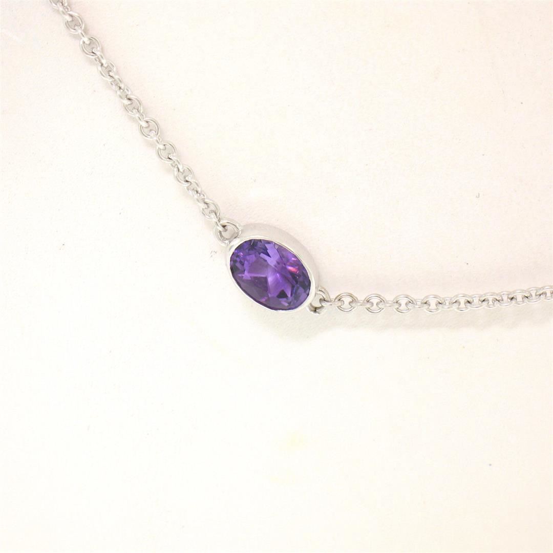A new solid 14k white gold by the yard necklace, with 18 oval cut natural amethysts (19.72ctw). It weighs a total of 19.20 grams, measures 5.91mm wide, and measures 38 inches in length.