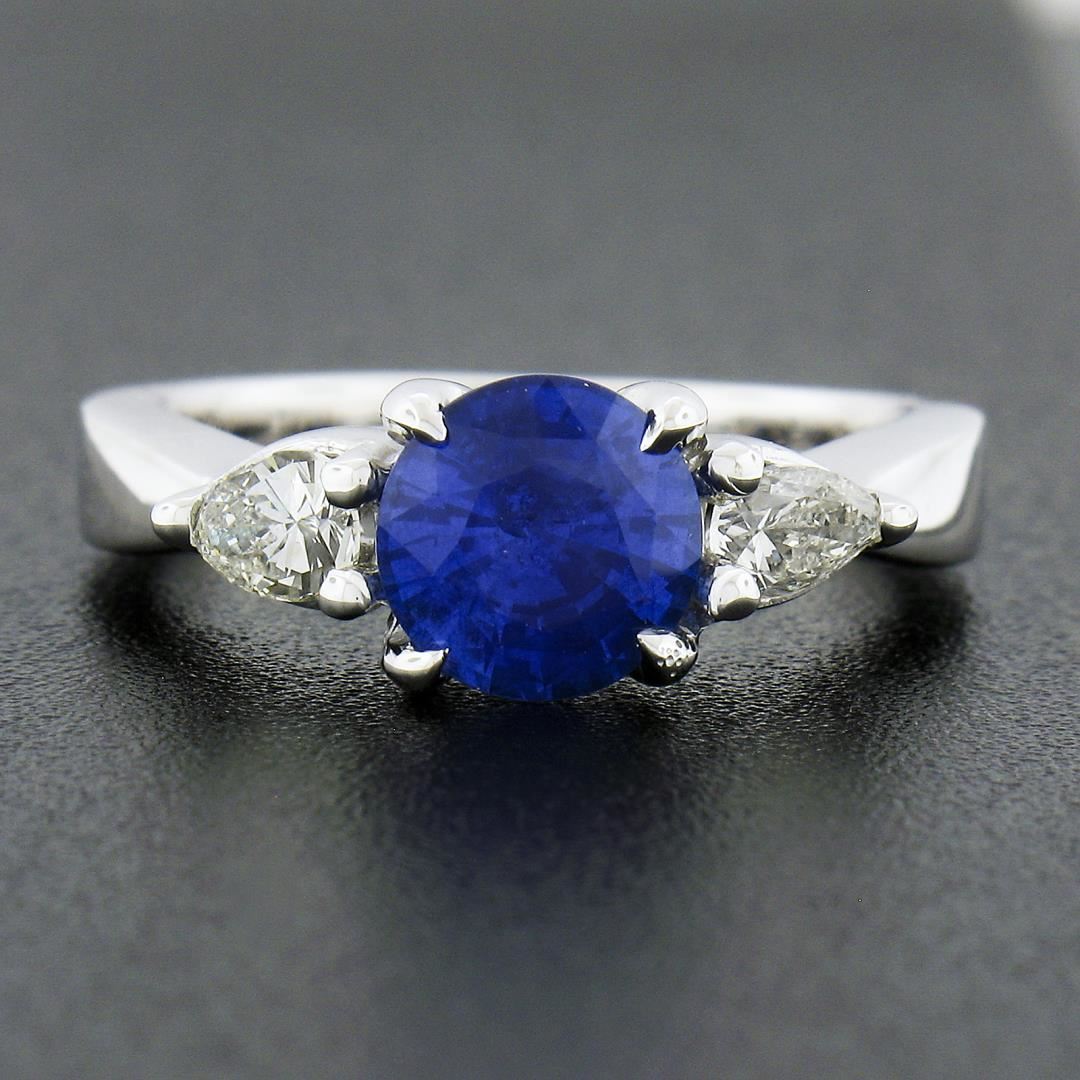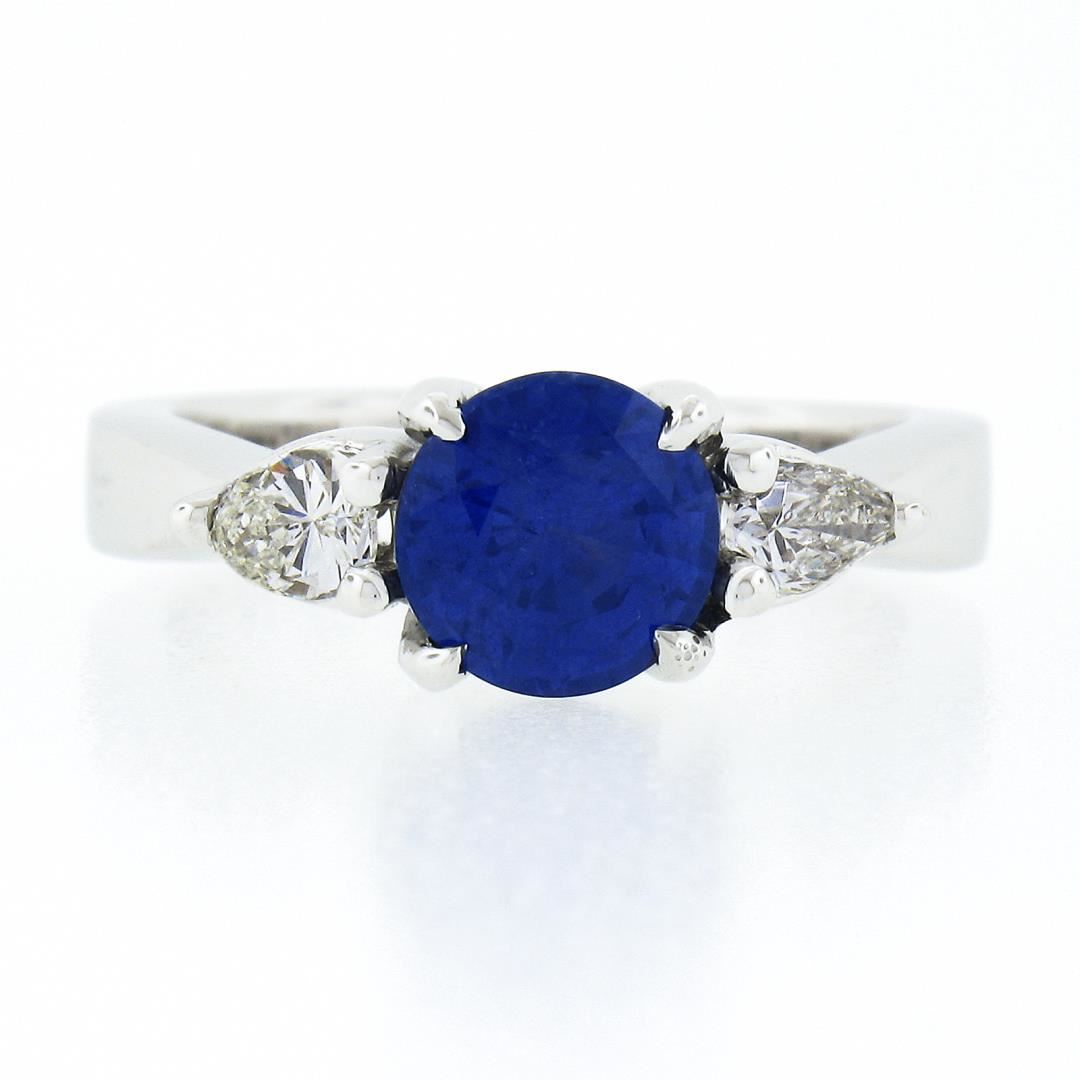 A solid 14k white gold ring, with 1 GIA graded round cut natrual sapphire (1.55ct ), and 2 pear cut natural diamonds (H/I - VS1/VS2 ; 0.46ctw). The ring is size 6.0, weighs a total of 5.90 grams, and measures 7mm wide. Comes with all original relevant certifications.