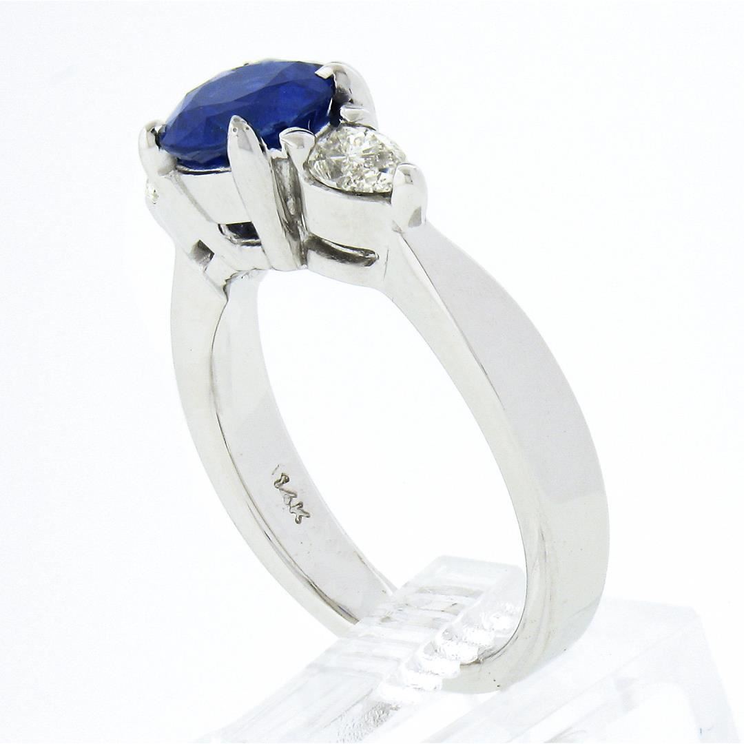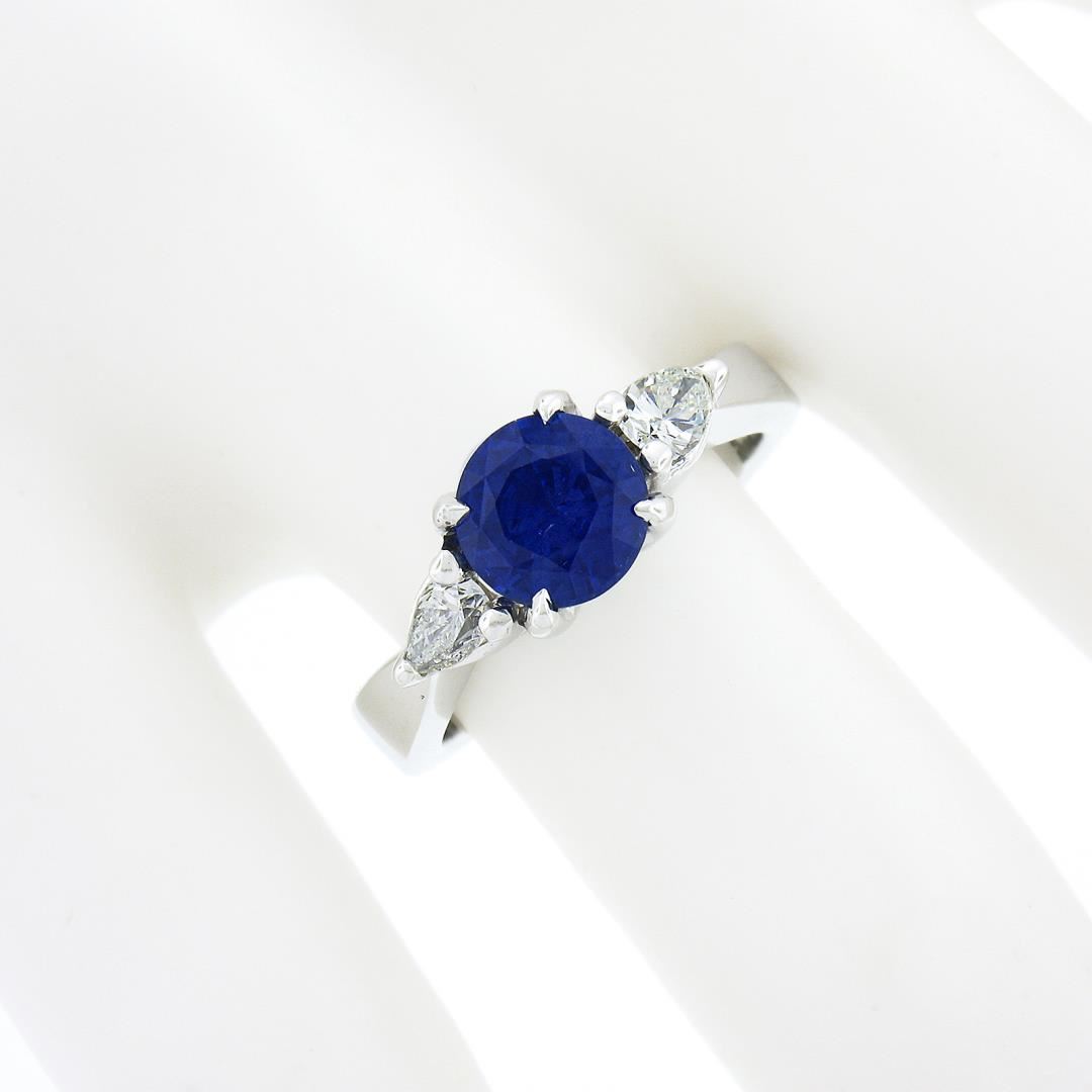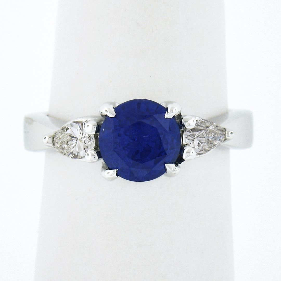 A solid 14k white gold ring, with 1 GIA graded round cut natrual sapphire (1.55ct ), and 2 pear cut natural diamonds (H/I - VS1/VS2 ; 0.46ctw). The ring is size 6.0, weighs a total of 5.90 grams, and measures 7mm wide. Comes with all original relevant certifications.