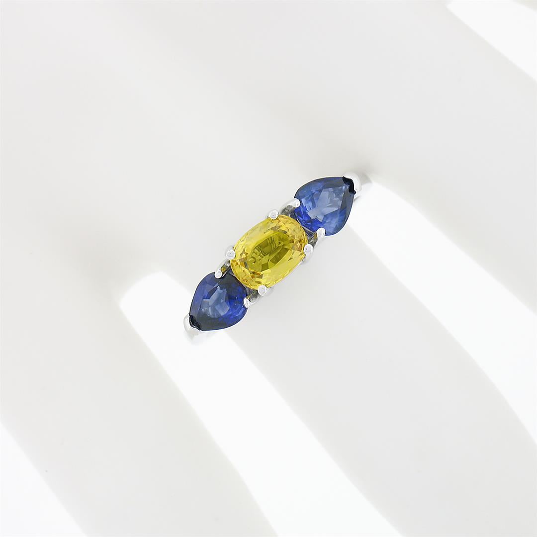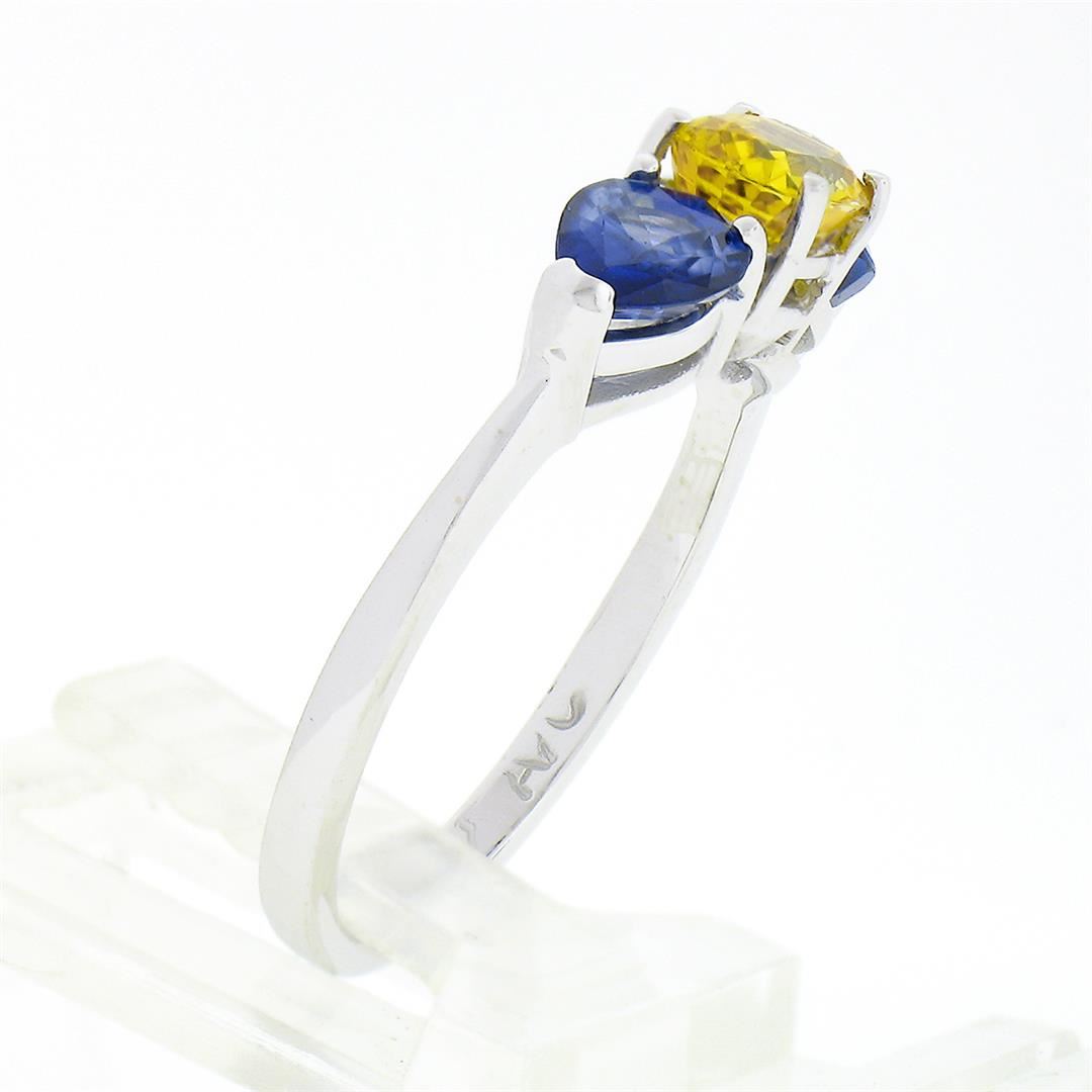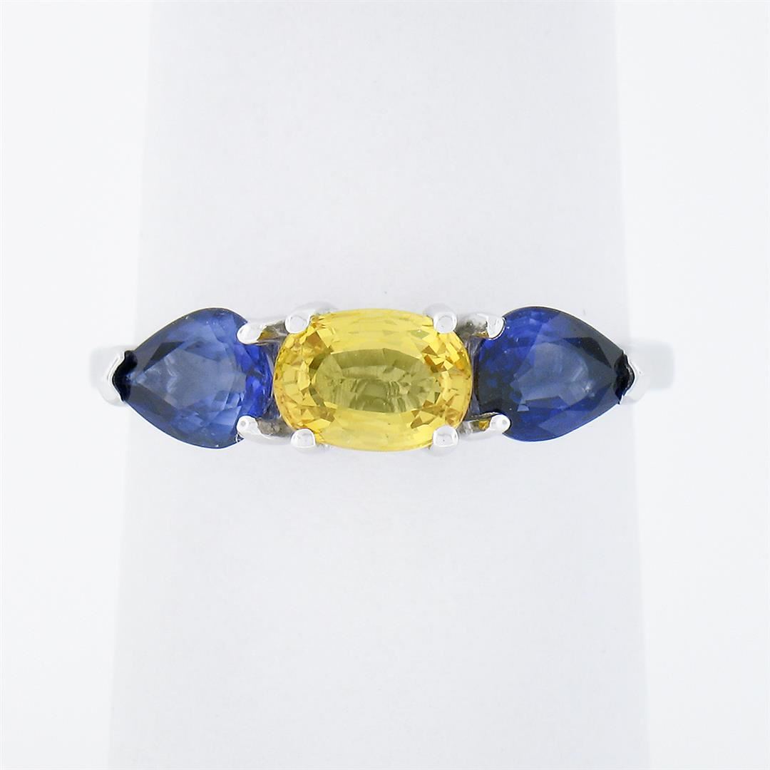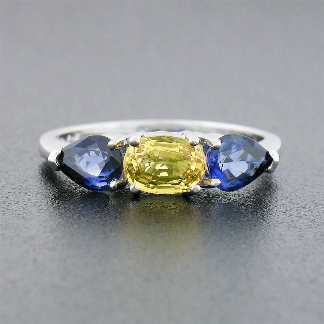 A solid 14k white gold 3 stones ring, featuring 1 oval brilliant cut natural yellow sapphire (1.00ct ), and 2 pear cut natural blue sapphires (1.25ctw). The ring is size 7.0, weighs a total of 2.87 grams, and measures 5.1mm wide.