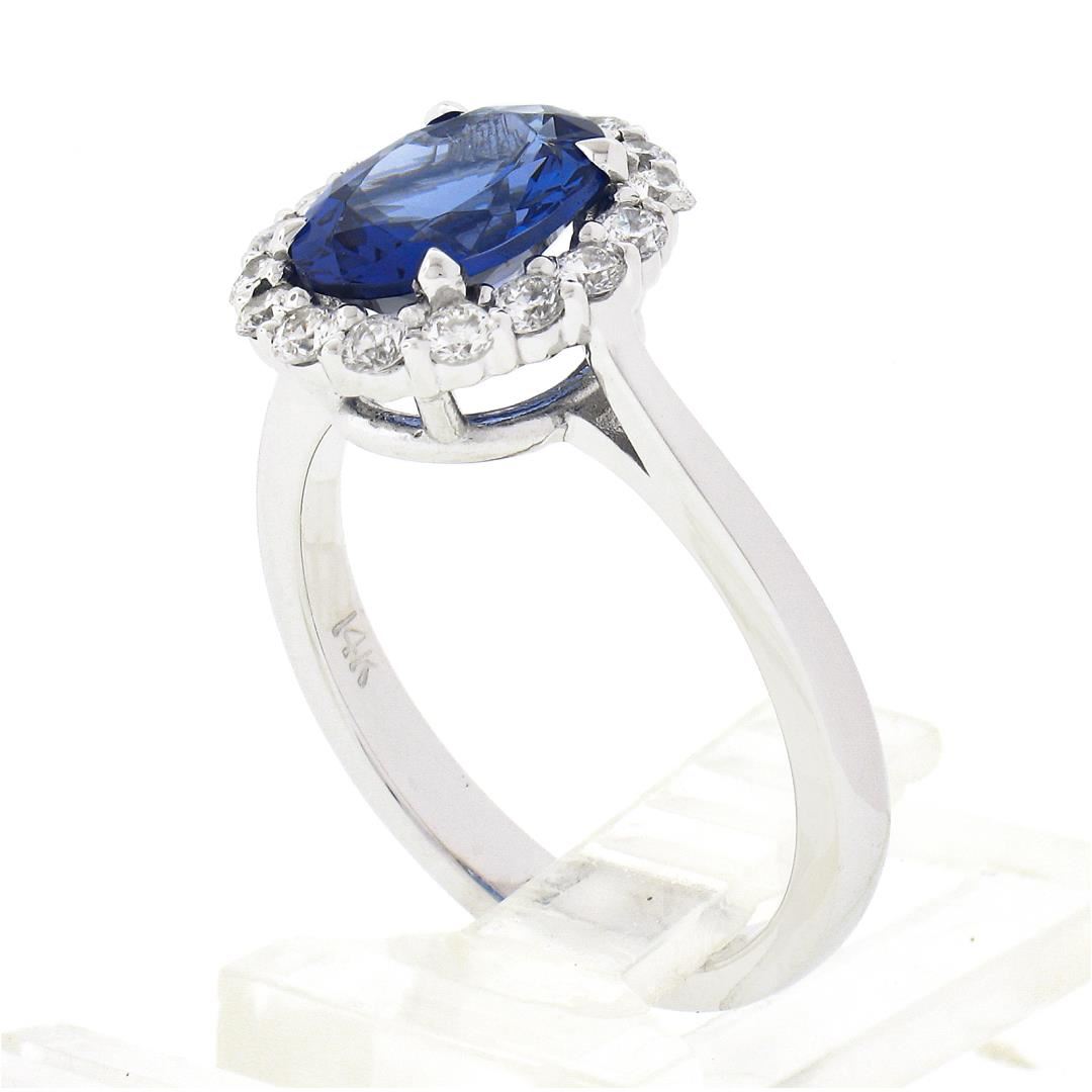 A solid 14k white gold ring, with 1 oval cut natural tanzanite (2.16ct), and a halo of 16 round brilliant cut natural diamonds (G/H - VS2/SI1 ; 0.44ctw). The ring is size 6.5, weighs a total of 4.19 grams, and measures 12.90mm wide.
