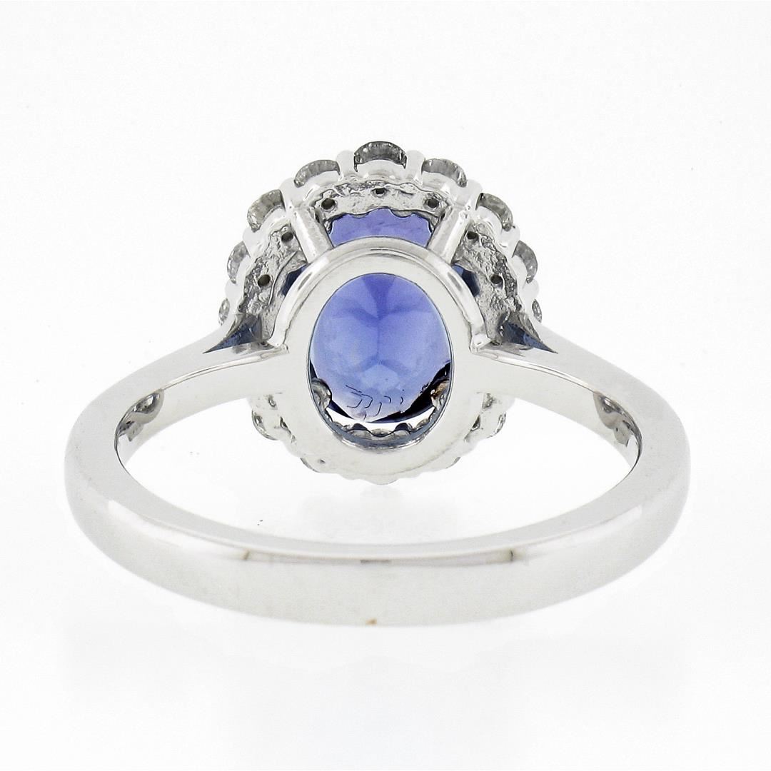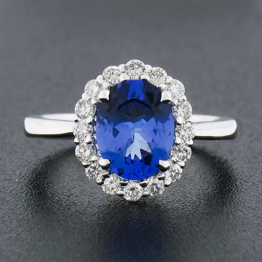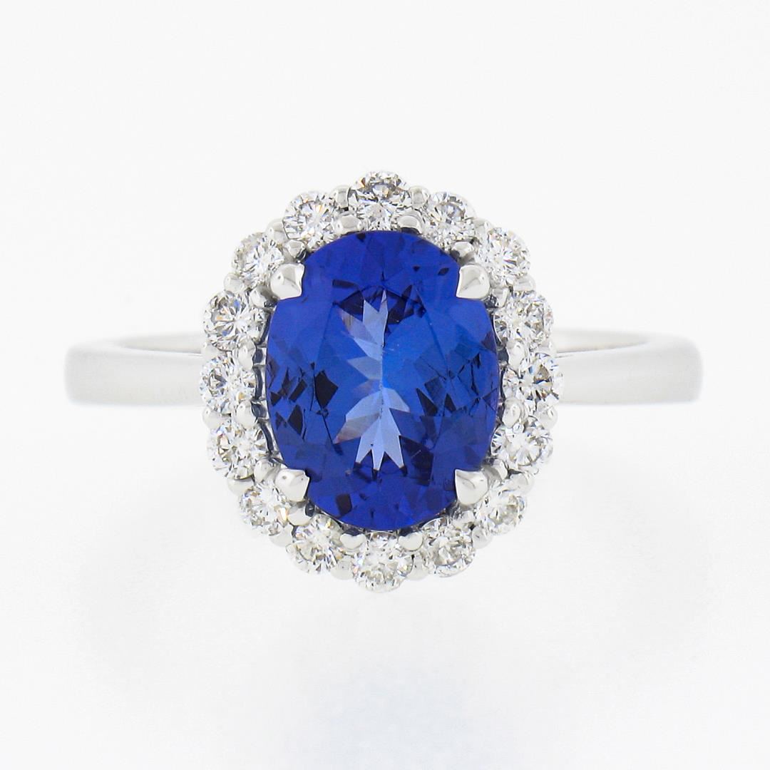 A solid 14k white gold ring, with 1 oval cut natural tanzanite (2.16ct), and a halo of 16 round brilliant cut natural diamonds (G/H - VS2/SI1 ; 0.44ctw). The ring is size 6.5, weighs a total of 4.19 grams, and measures 12.90mm wide.