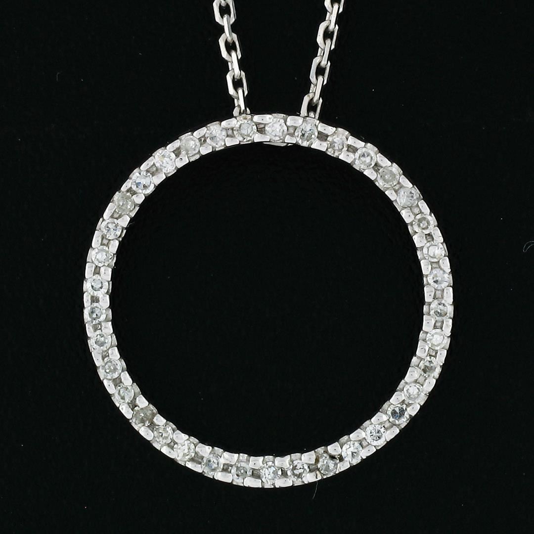 A solid 14k white gold circle of life pendant with 37 round single cut natural diamonds (H/I - SI1/SI2; 0.20ctw) on 16 inch cable link chain. The pendant weighs a total of 2.32 gram and measures 16.15mm in diameter including the bail.