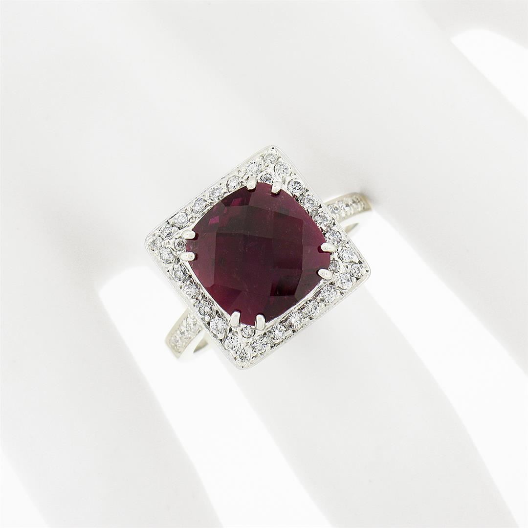 A solid 14k white gold ring, with 1 Gia certified cushion checkerboard cut natural tourmaline (5.0ct), and 42 round brilliant cut natural diamonds (G/H - VS1/VS2 ; 0.60ctw). The ring is size 7.5, weighs a total of 6.83 grams, and measures 14.0mm wide. Com