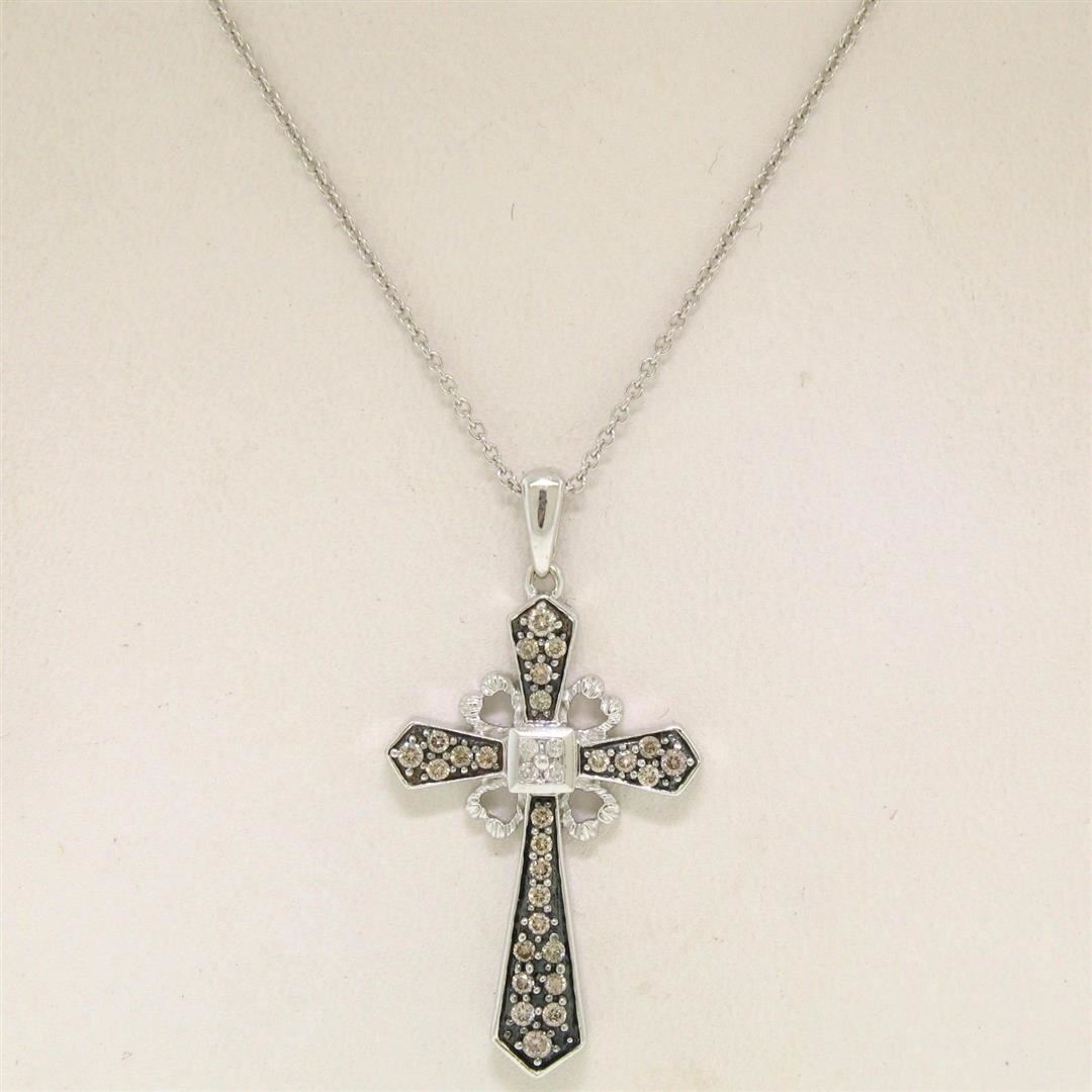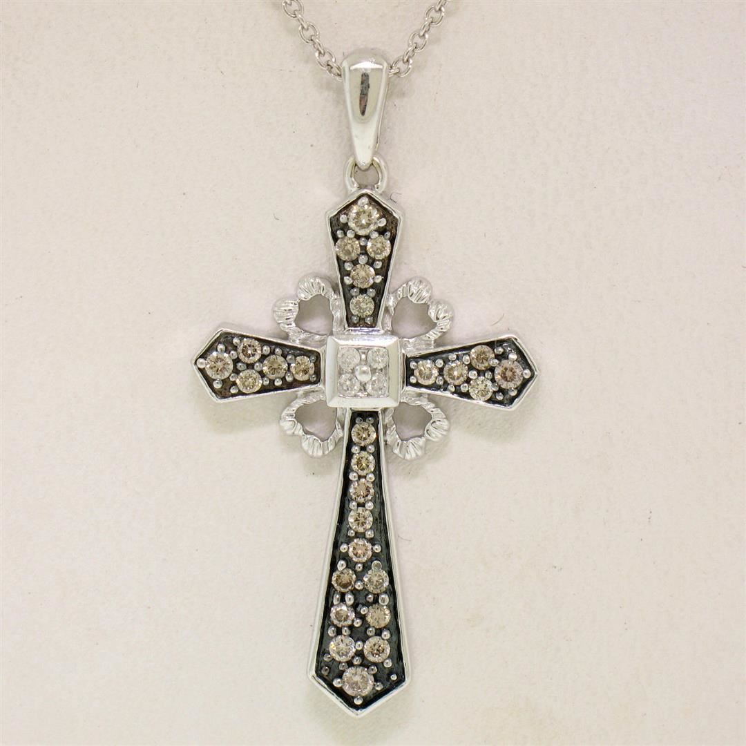 An estate solid 14k white gold and black rhodium cross pendant necklace, with 4 round brilliant cut natural diamonds (G- VS2; 0.10ctw), surrounded with 25 round brilliant cut natural diamonds (fancy brown color- VS2; 0.60ctw). 18 inch fine cable link chain, 5.0 grams total weight, pendant measures 36.76x19.35mm.