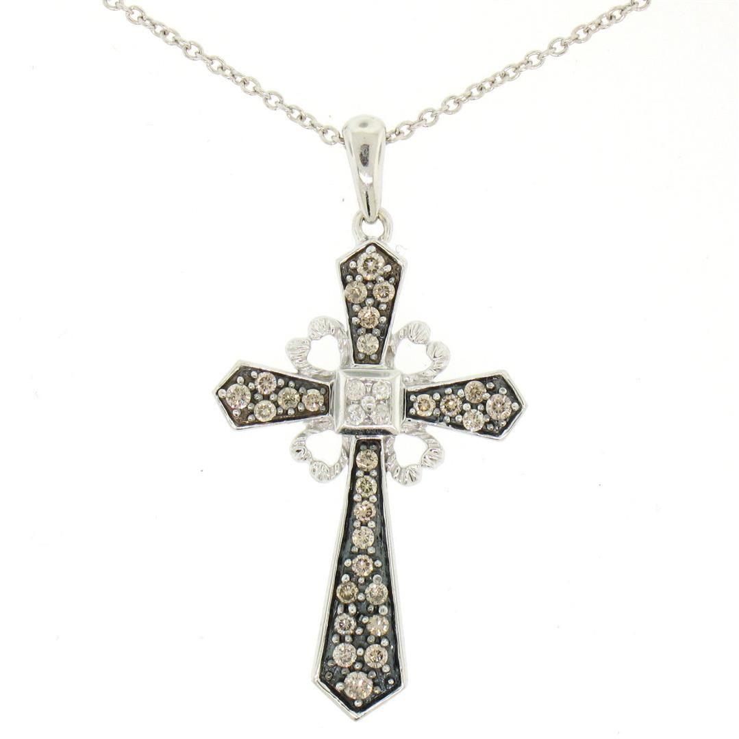 An estate solid 14k white gold and black rhodium cross pendant necklace, with 4 round brilliant cut natural diamonds (G- VS2; 0.10ctw), surrounded with 25 round brilliant cut natural diamonds (fancy brown color- VS2; 0.60ctw). 18 inch fine cable link chain, 5.0 grams total weight, pendant measures 36.76x19.35mm.