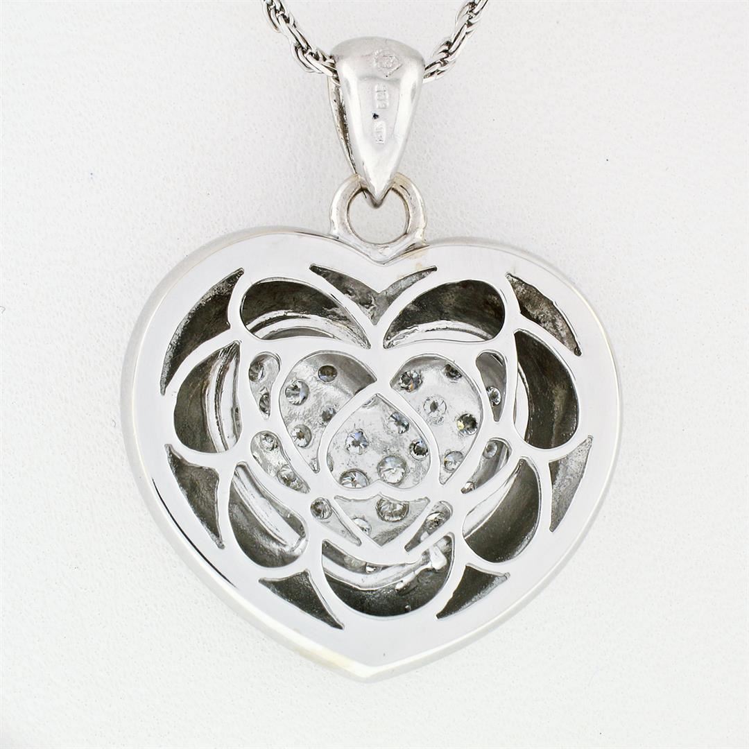A solid 14k white gold heart pendant with 35 round brilliant cut natural diamonds (G/H - SI2/I1; 0.75ctw). 18 inch fine rope link chain, 11.68 grams total weight, pendant measures 32.90x25.98mm.