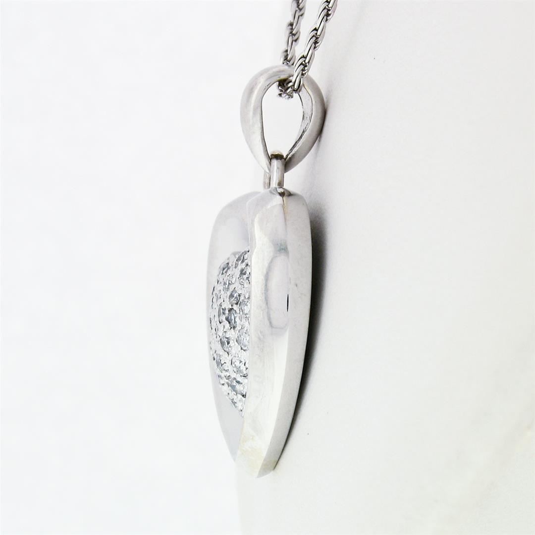A solid 14k white gold heart pendant with 35 round brilliant cut natural diamonds (G/H - SI2/I1; 0.75ctw). 18 inch fine rope link chain, 11.68 grams total weight, pendant measures 32.90x25.98mm.