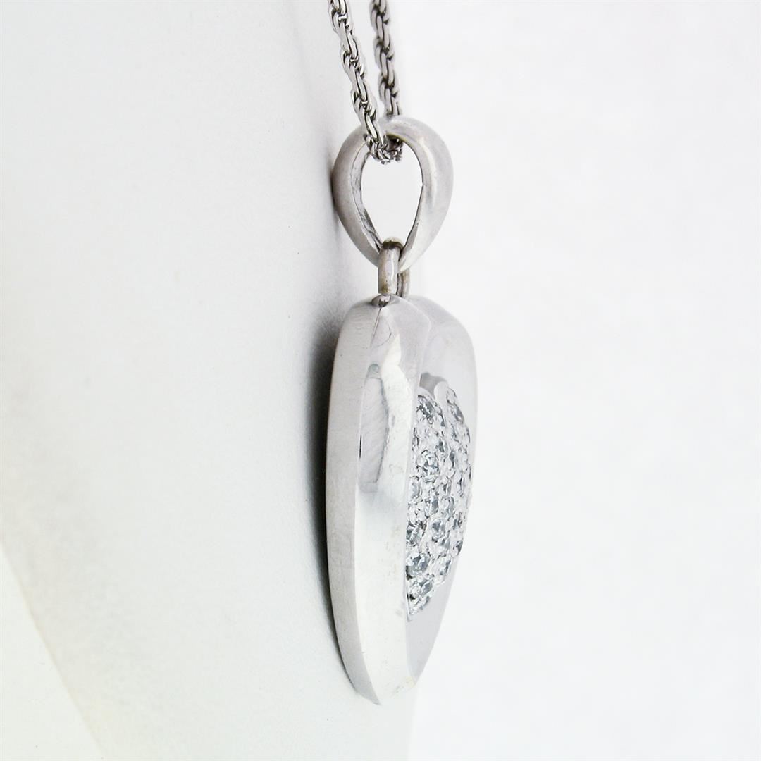 A solid 14k white gold heart pendant with 35 round brilliant cut natural diamonds (G/H - SI2/I1; 0.75ctw). 18 inch fine rope link chain, 11.68 grams total weight, pendant measures 32.90x25.98mm.