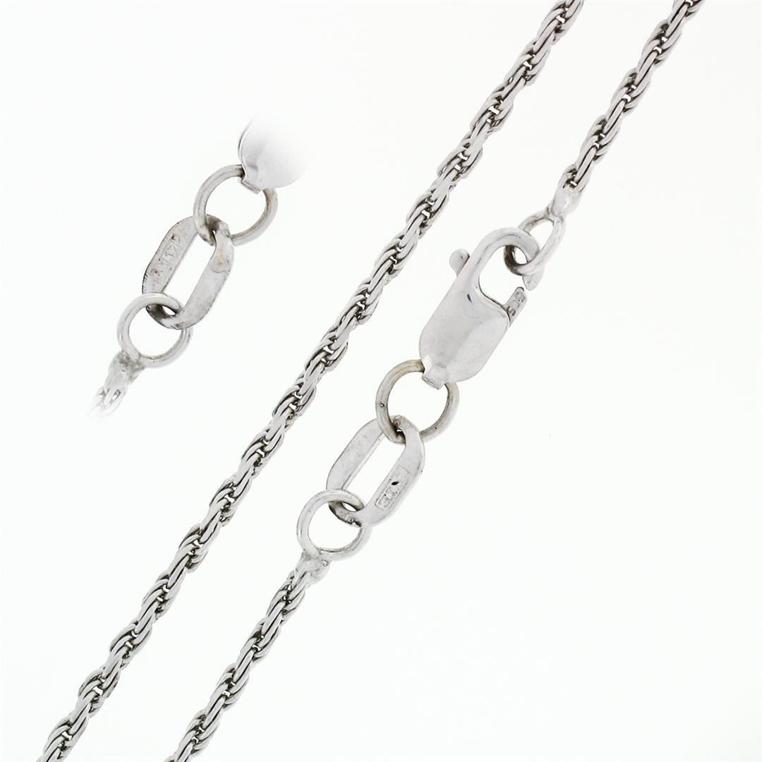 A solid 14k white gold heart pendant with 35 round brilliant cut natural diamonds (G/H - SI2/I1; 0.75ctw). 18 inch fine rope link chain, 11.68 grams total weight, pendant measures 32.90x25.98mm.