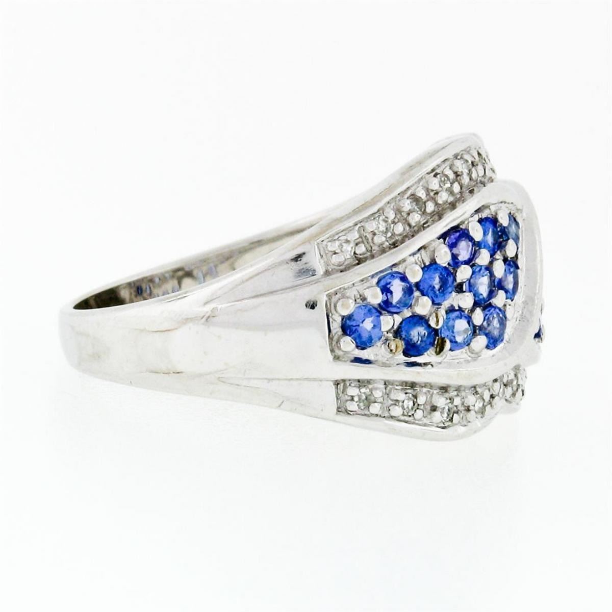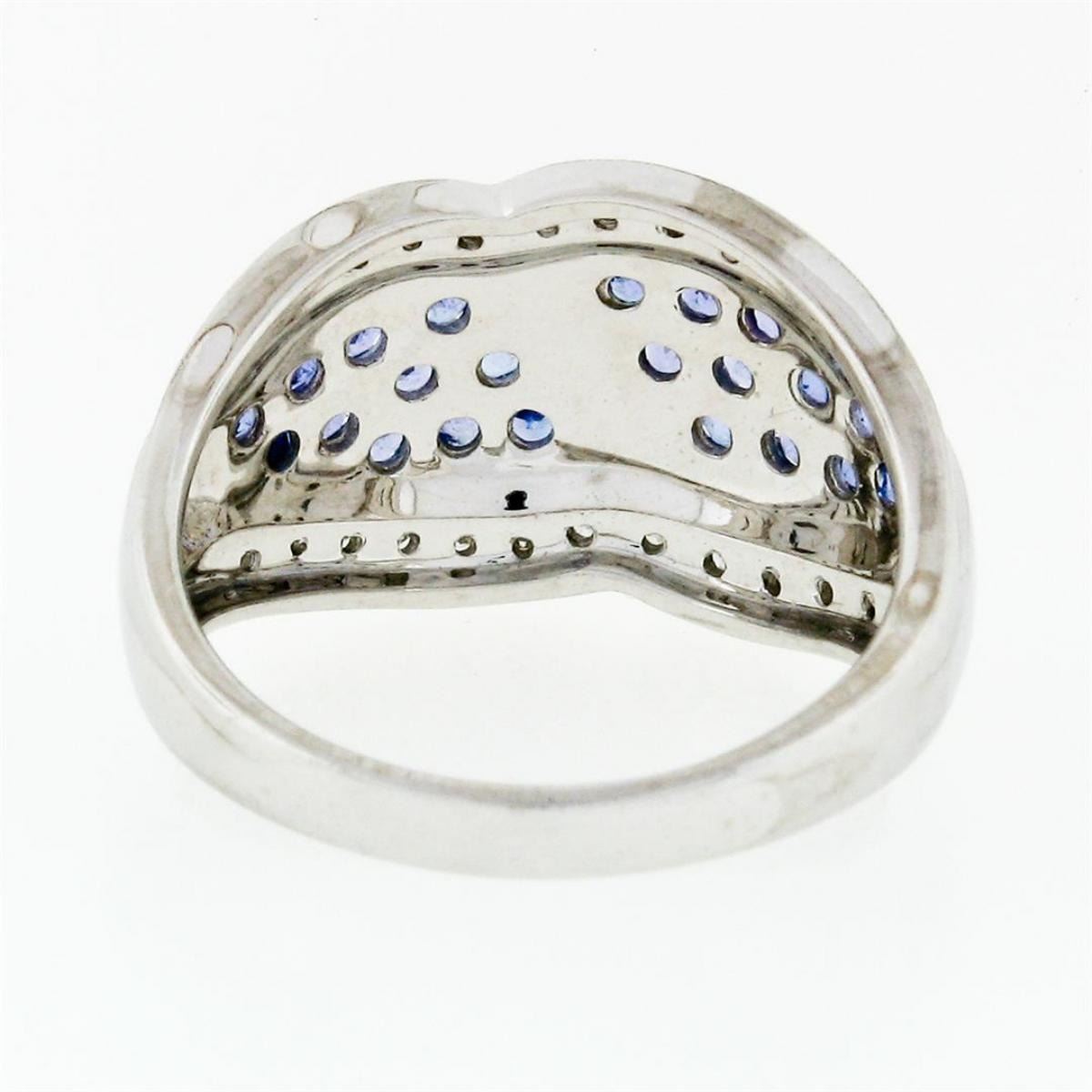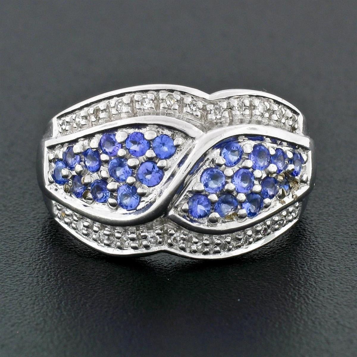 14k White Gold .85ctw Round Brilliant Tanzanite & Diamond Wide Cluster Band Ring. A solid 14k white gold band ring with 22 round brilliant cut natural tanzanites (0.65ctw) framed by 24 round brilliant cut natural diamonds (G/H - VS2 to SI2; 0.20ctw). The ring is size 7.0, weighs a total of 5.57 grams, and measures 12.75mm wide.