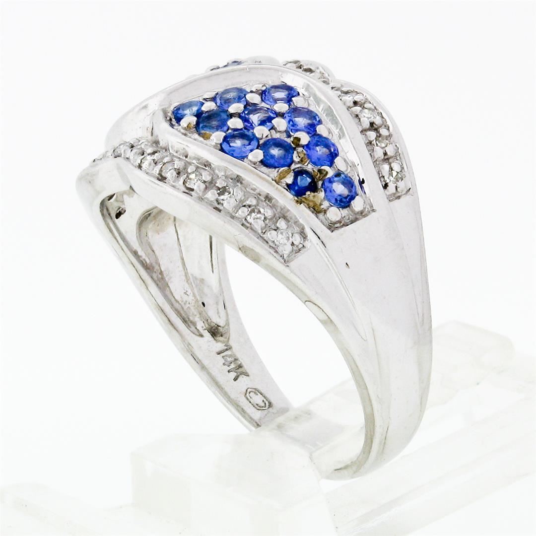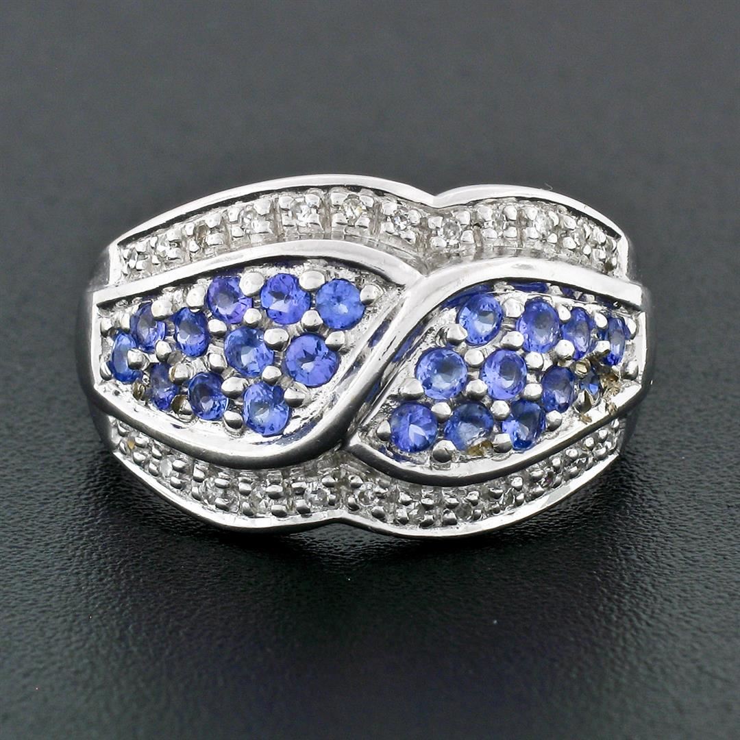 An estate solid 14 white gold wide cluster ring, with 22 round brilliant cut natural tanzanite (0.65ctw), and 24 round brilliant cut natural diamonds (G/H - VS2-SI2 ; 0.20ctw). The ring is size 7, weighs a total of 5.57 grams, and measures 12.75mm wide.