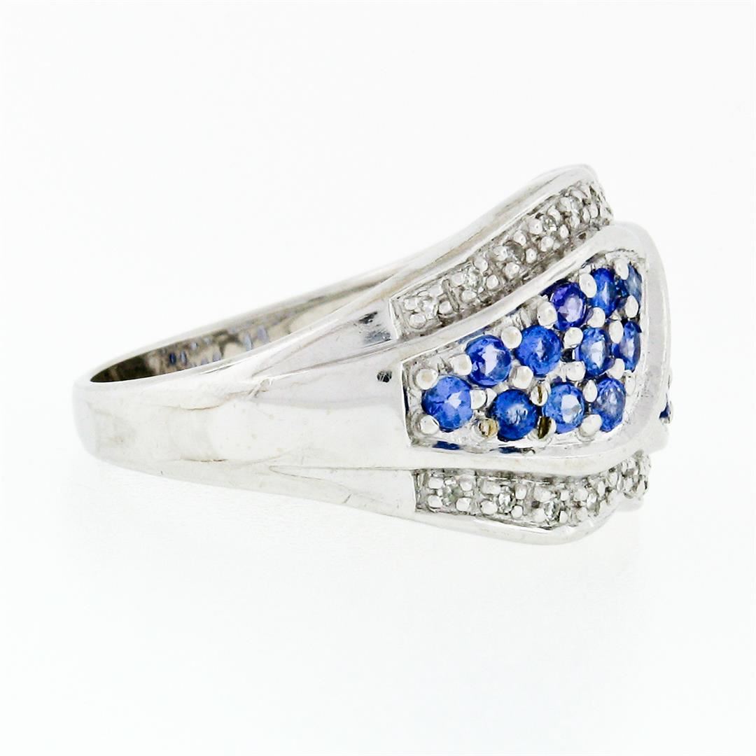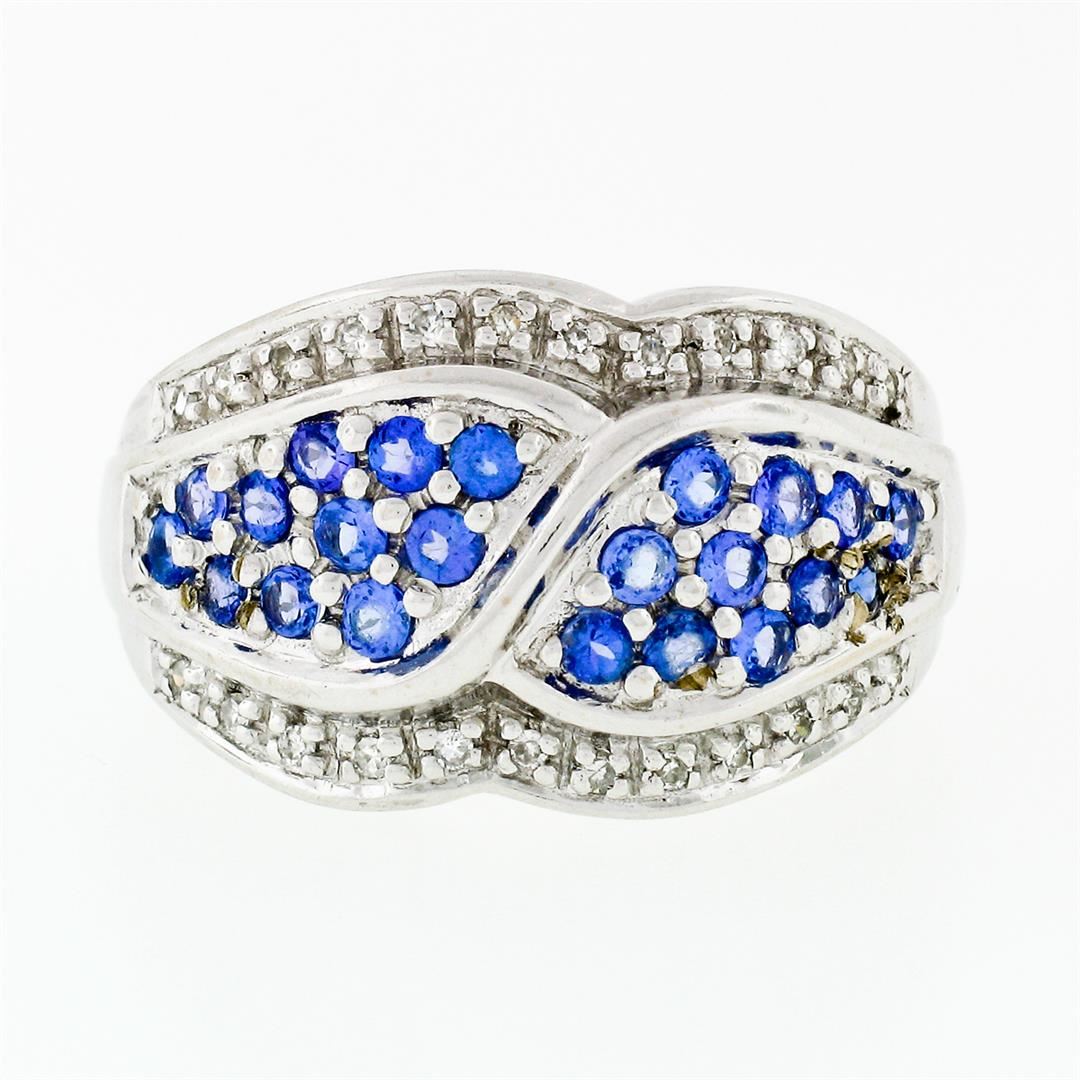 An estate solid 14 white gold wide cluster ring, with 22 round brilliant cut natural tanzanite (0.65ctw), and 24 round brilliant cut natural diamonds (G/H - VS2-SI2 ; 0.20ctw). The ring is size 7, weighs a total of 5.57 grams, and measures 12.75mm wide.
