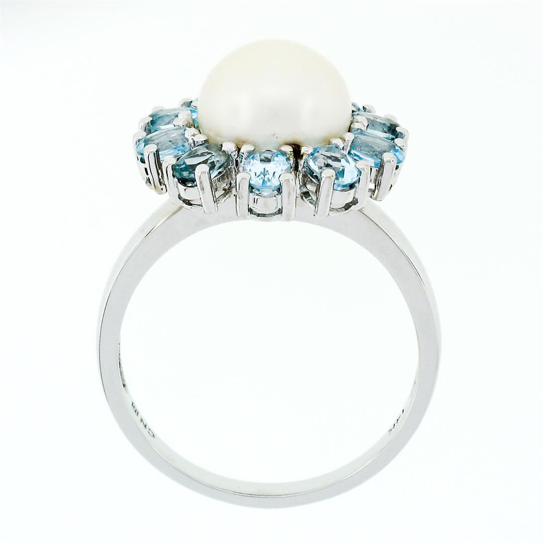 A solid 14k white gold ring with 1 round cultured pearl (9.72 to 9.75mm) and a halo of 33 oval brillaint cut natural aquamarines (2.00ctw). The ring is size 9.5, weighs a total of 6.20 grams, and measures 17.67mm wide.