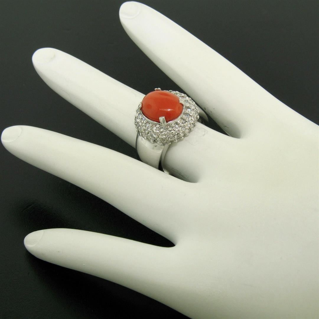 A 14k white gold ring with an 11.4x9.2mm oval cabochon red coral with 2.10ctw of round diamonds (F - VS1/VS2). The ring is size 6.0, weighs a total of 12.1 grams, and measures 16.5mm wide.