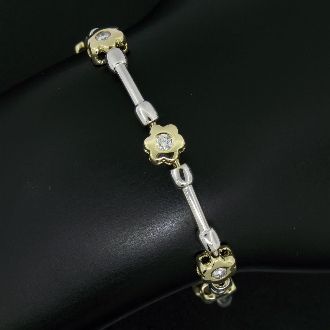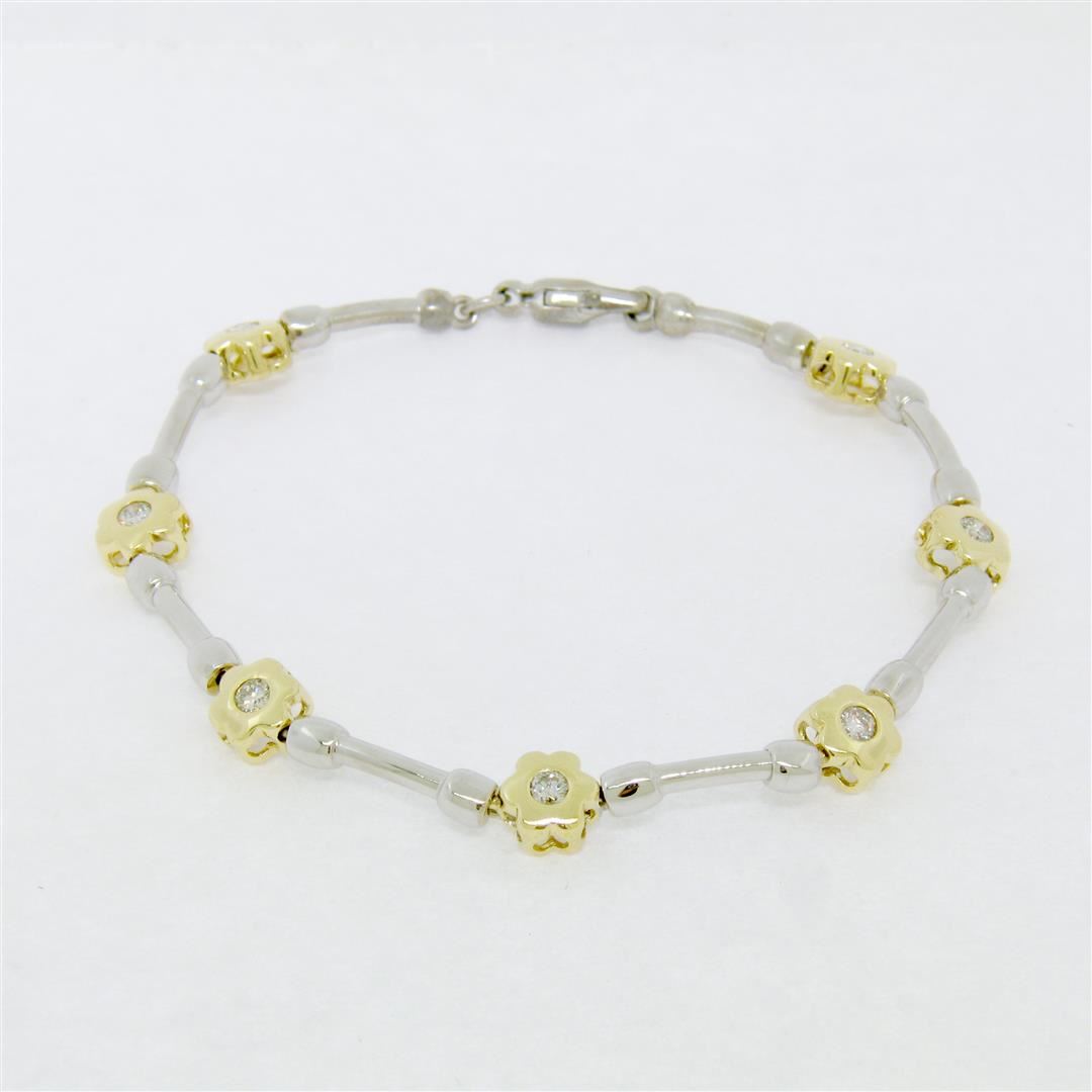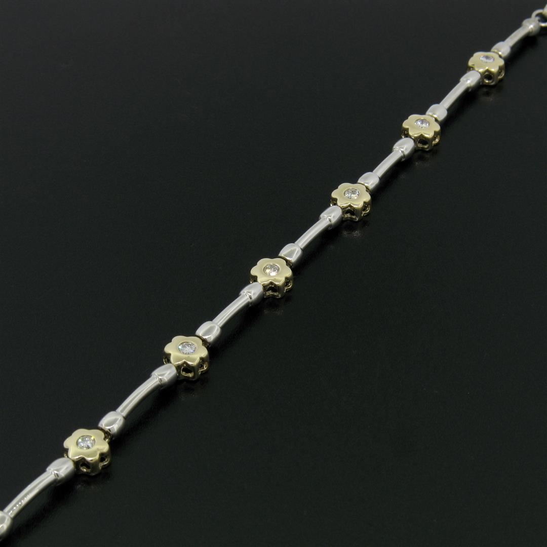 A like new 14k gold bracelet with 0.50ctw of round diamonds (G/H - VS1/VS2) burnish set into yellow gold flower links which are connected with white gold barbell links. It weighs a total of 10.65 grams, measures 6.45mm wide, and measures 7.5 inches in len