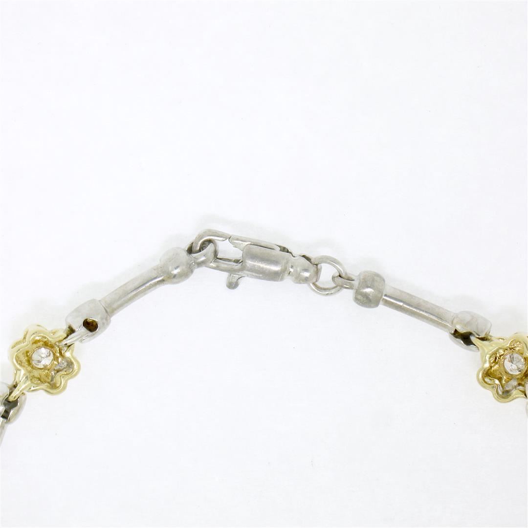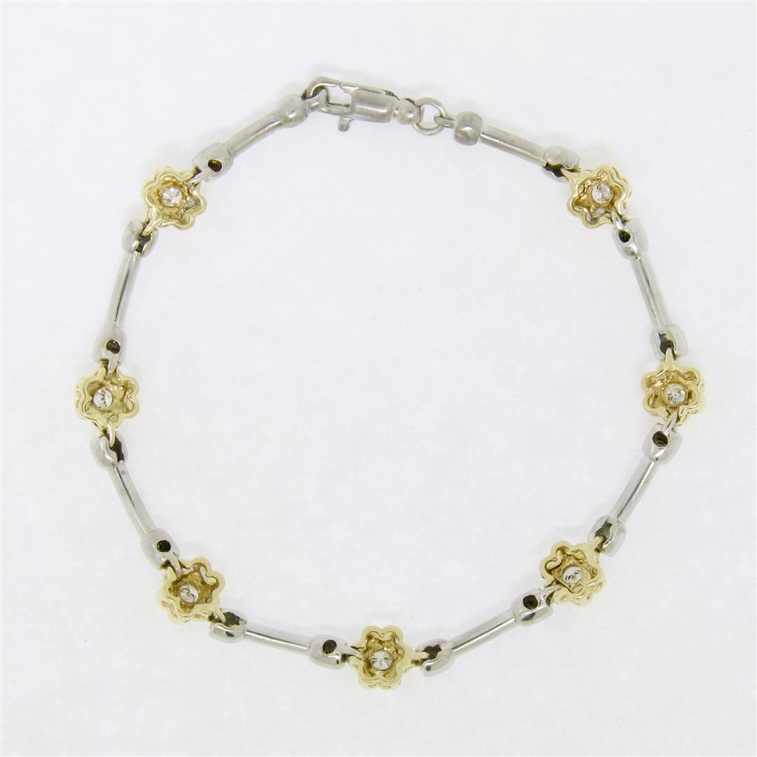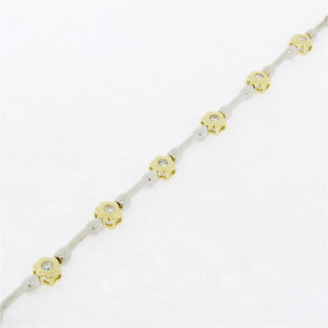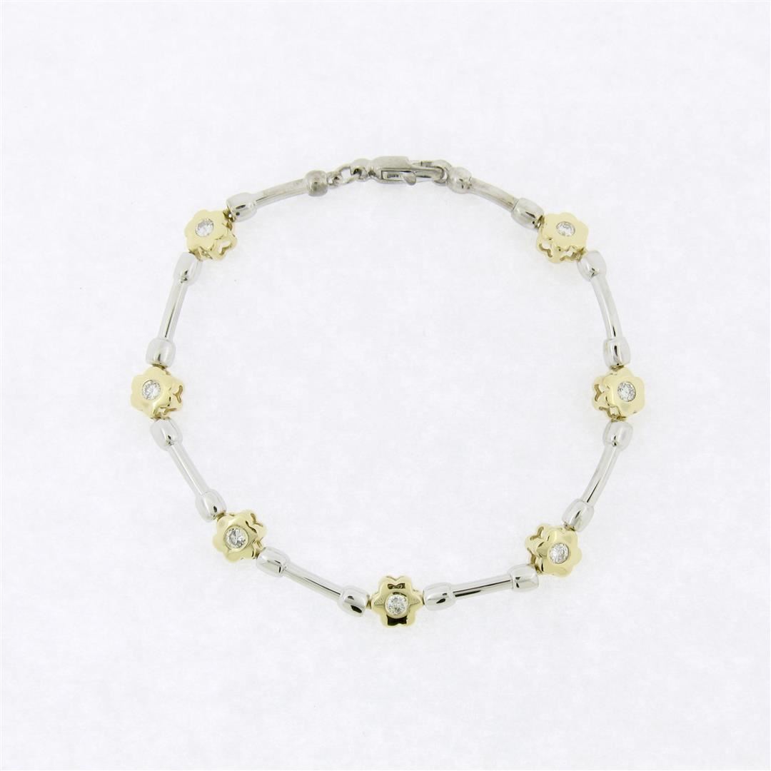 A like new 14k gold bracelet with 0.50ctw of round diamonds (G/H - VS1/VS2) burnish set into yellow gold flower links which are connected with white gold barbell links. It weighs a total of 10.65 grams, measures 6.45mm wide, and measures 7.5 inches in len