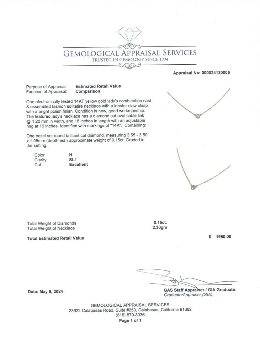 A timeless 14KT yellow gold solitaire necklace featuring a bezel-set round brilliant-cut diamond weighing 0.15ct. The diamond is graded H in color and SI-1 in clarity, ensuring brilliance and clarity. Suspended from an 18-inch oval cable link chain with an adjustable length, this piece is both elegant and versatile.