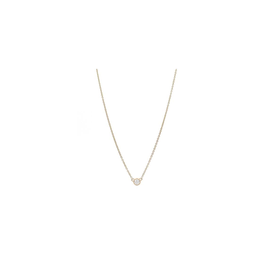 A timeless 14KT yellow gold solitaire necklace featuring a bezel-set round brilliant-cut diamond weighing 0.15ct. The diamond is graded H in color and SI-1 in clarity, ensuring brilliance and clarity. Suspended from an 18-inch oval cable link chain with an adjustable length, this piece is both elegant and versatile.