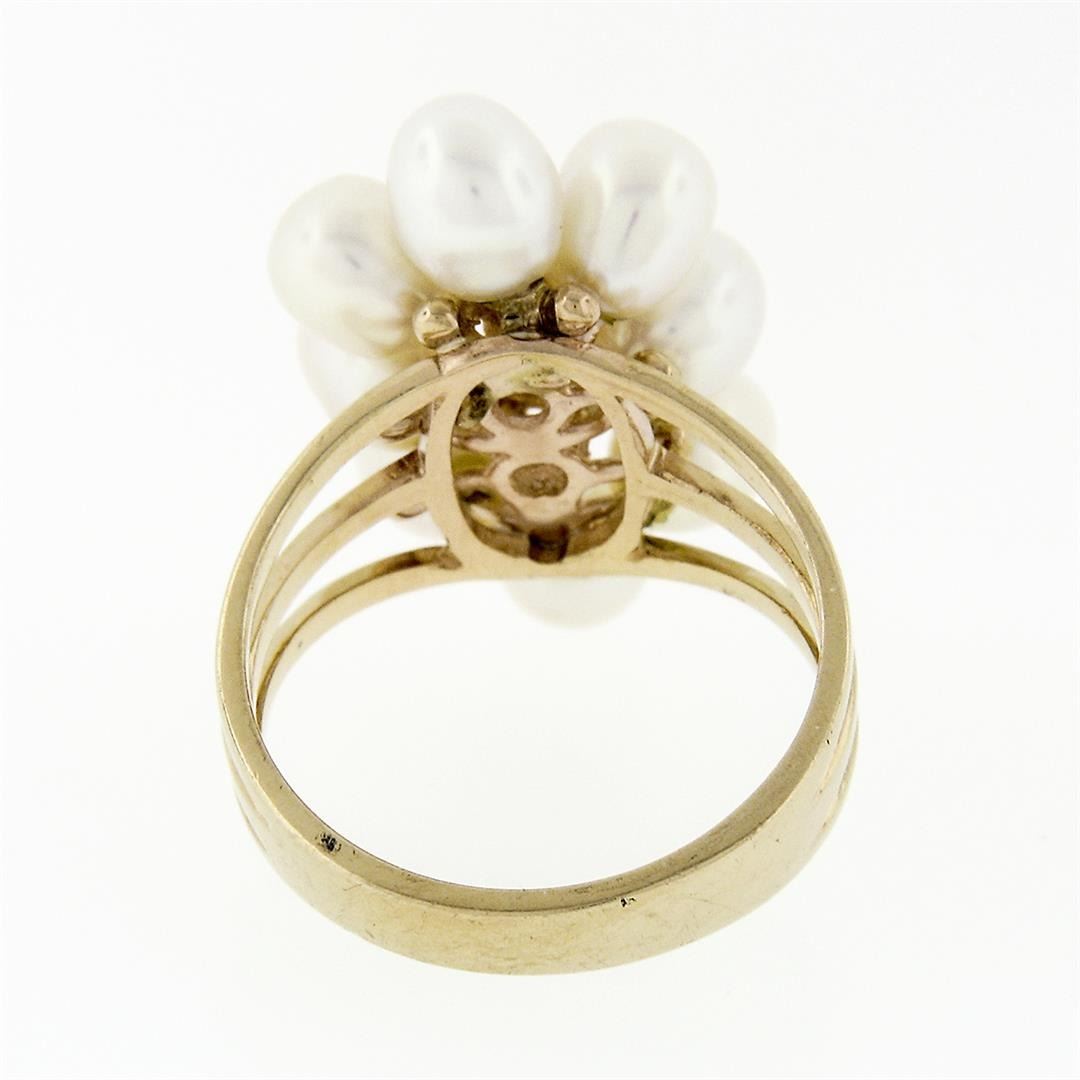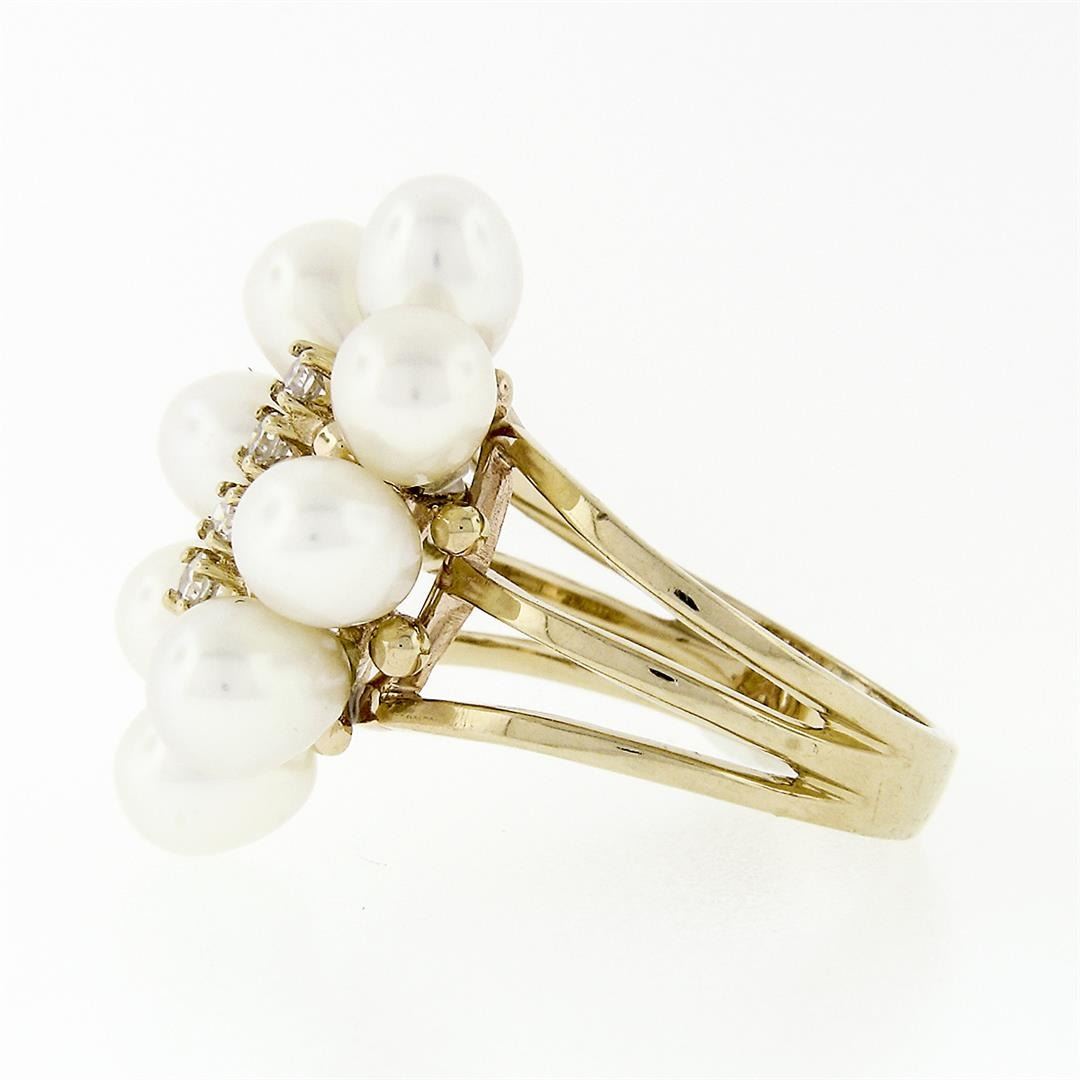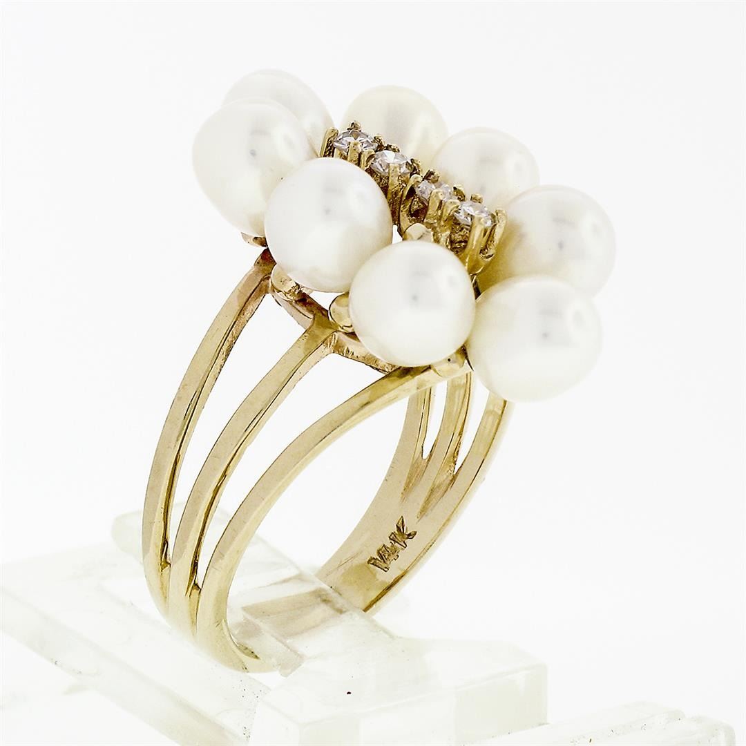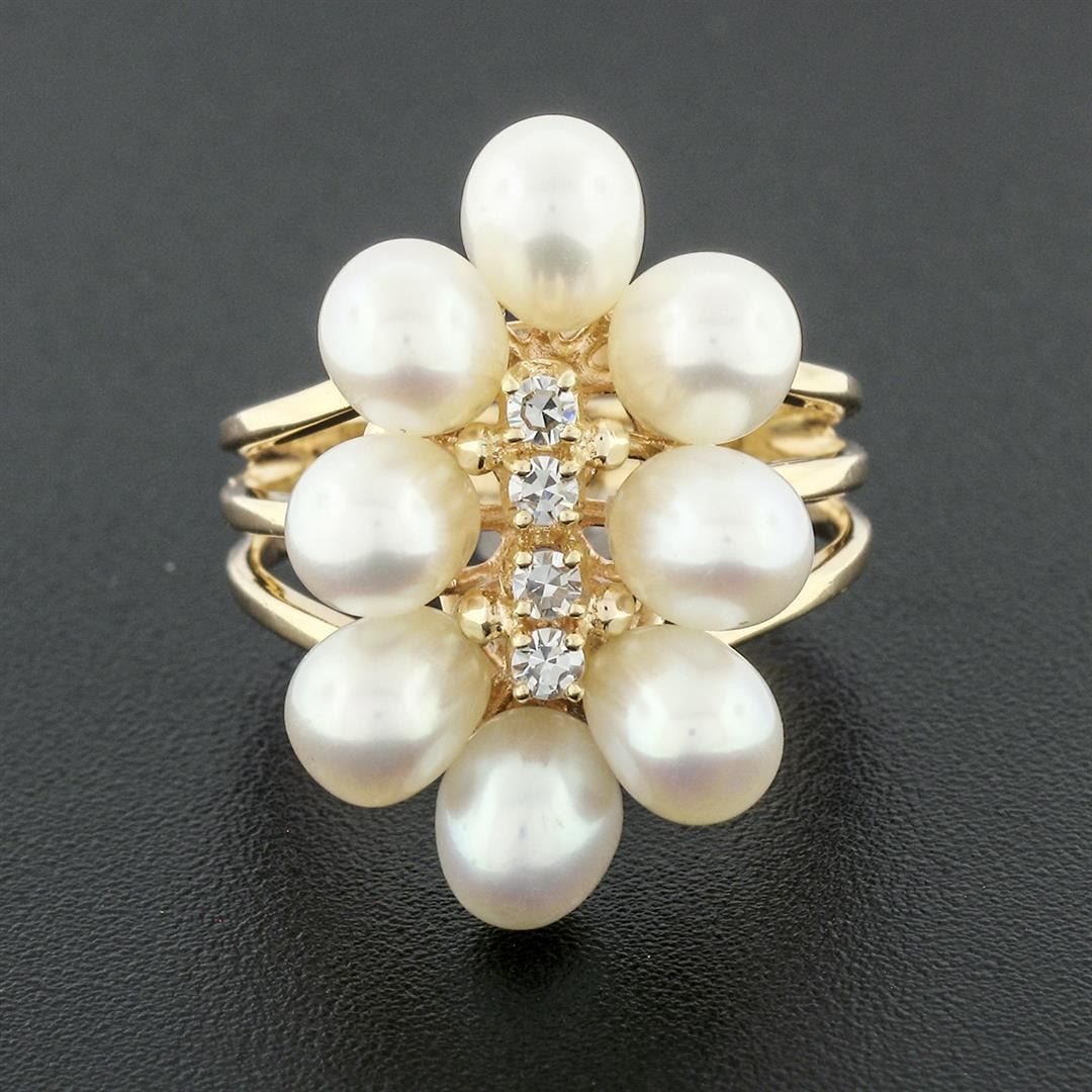 A solid 14k yellow gold cluster ring, with 4 round single cut natural diamonds (E/F - VVS1 ; 0.12ctw), surrounded with a halo of 8 oval shape natural cultured pearls (5.4x6.3mm). The ring is size 6.0, weighs a total of 5.44 grams, and measures 22.35mm wide.