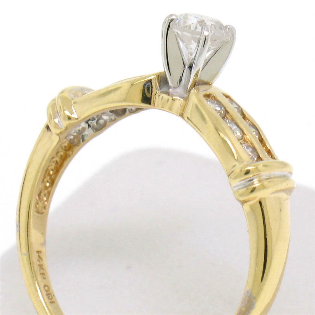 An estate solid 14k yellow and white gold solitaire ring, with 1 round brilliant cut natural diamond (G/H - SI1/SI2 ; 0.20ct). and 12 round brillaint cut natural diamonds (G/H - SI1/SI2 ; 0.10ctw). The ring is size 6.25, weighs a total of 2.8 grams, and measures 5.58mm wide.