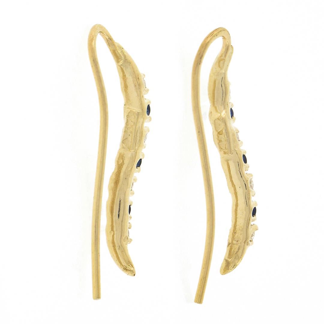 A solid 14k yellow gold dangle earrings, with 8 round brilliant cut natural diamonds (G/H - SI1/SI2 ; 0.16ctw), alternated with 6 round brilliant cut natural sapphires (0.15ctw). The earrings measure approximately 20.2x2mm and weigh a total of 1.30 grams.