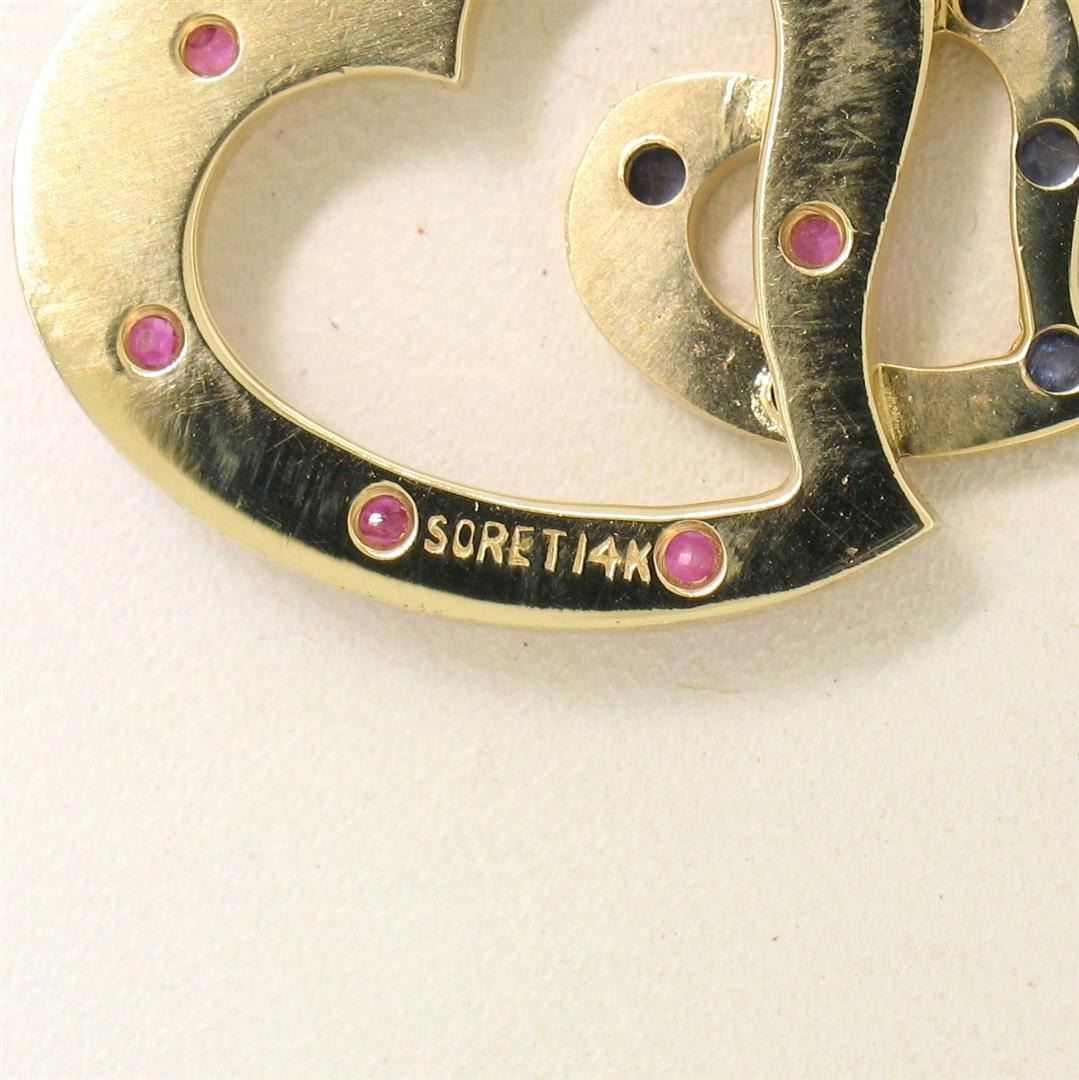 14k Yellow Gold 0.48ctw Round Ruby & Sapphire Double Heart Dual Finish Pendant. Please see photos and description for all available information. An estate solid 14k yellow gold double heart pendant necklace, featuring 7 round brilliant cut natural rubies (0.28ctw), and 5 round brilliant cut natural sapphires ( 0.20ctw). The pendant weighs a total of 6.20 grams, measures 30.5x23.6mm including the bail, 18 inch fine rope link chain.