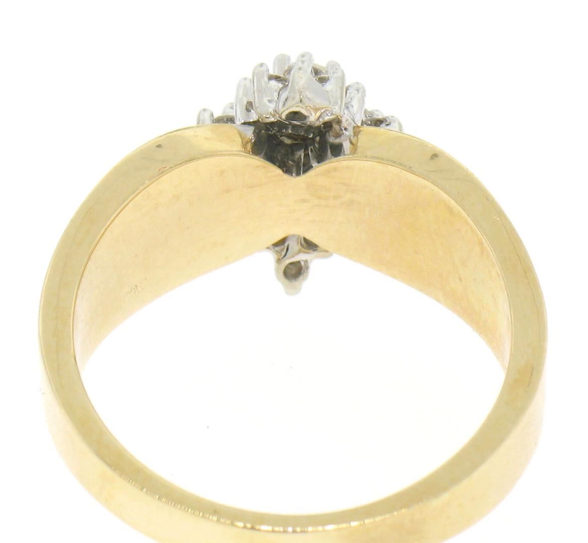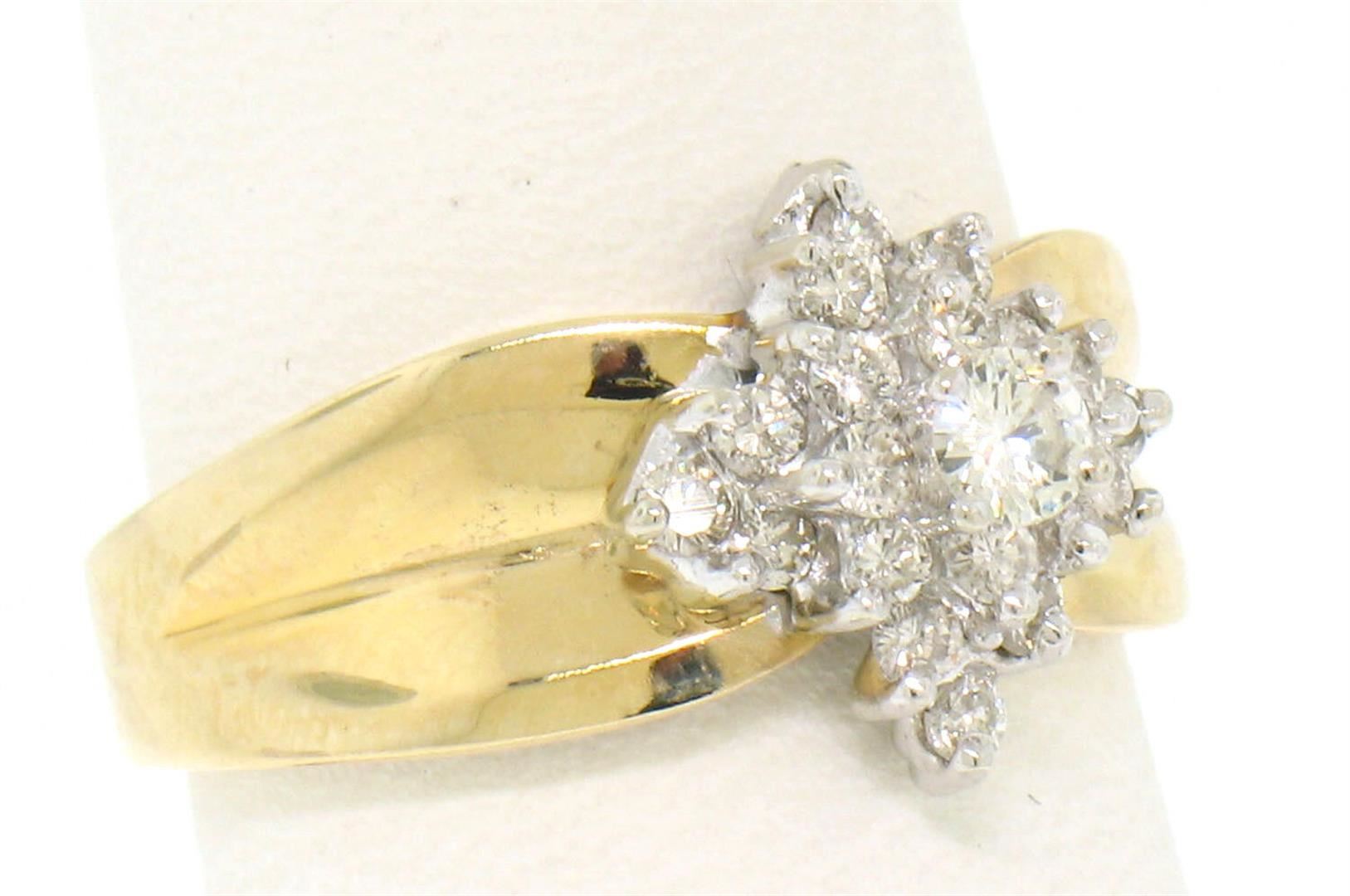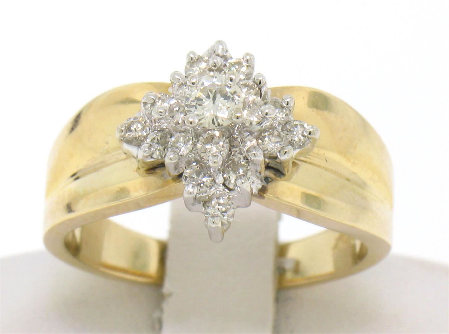 An estate solid 14k yellow gold cluster ring, featuring 21 round brilliant cut natural diamonds (G/H - VS2/SI1 ; 0.50ctw). The ring is size 6.25, weighs a total of 5.90 grams, and measures 11.66mm wide.