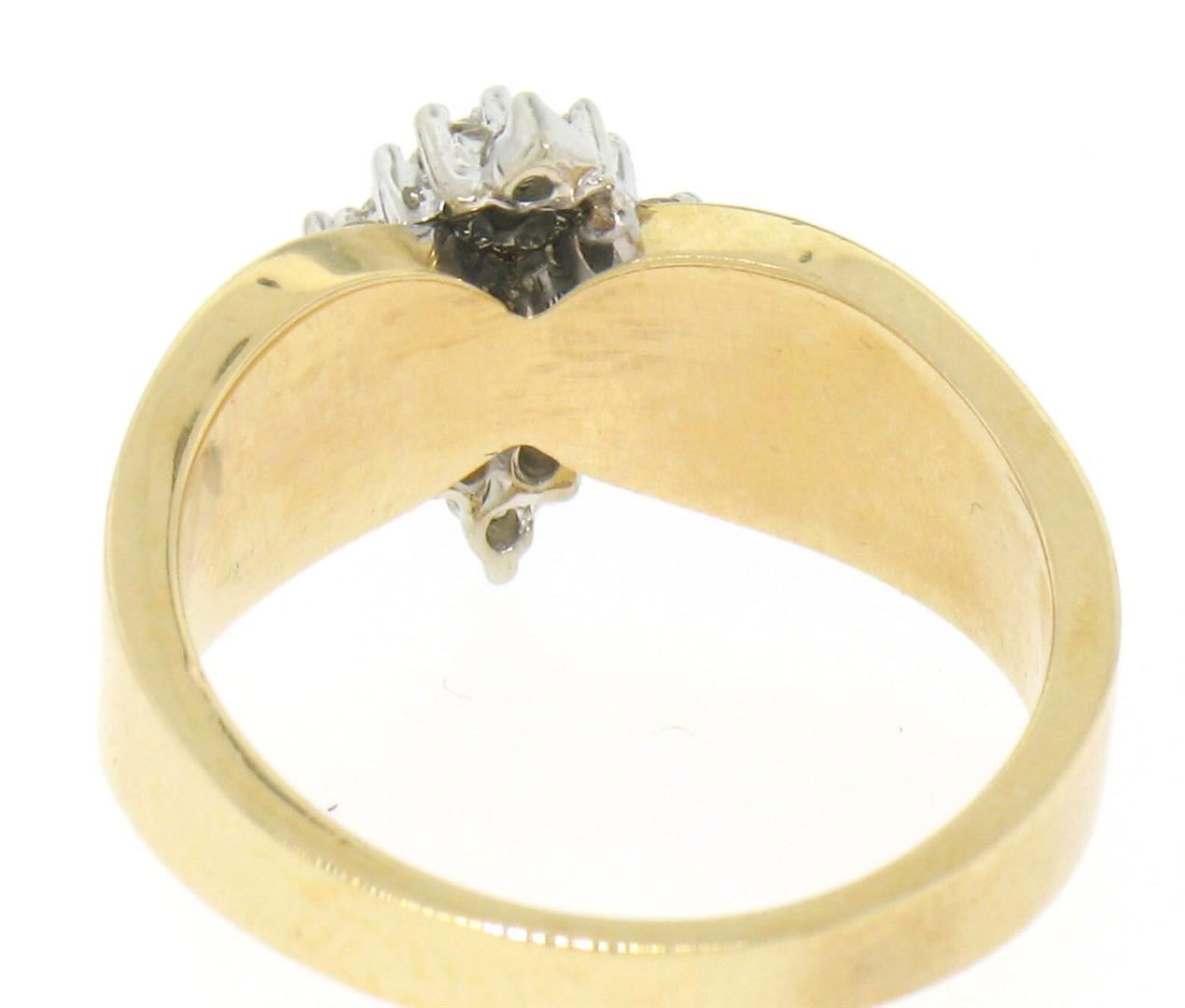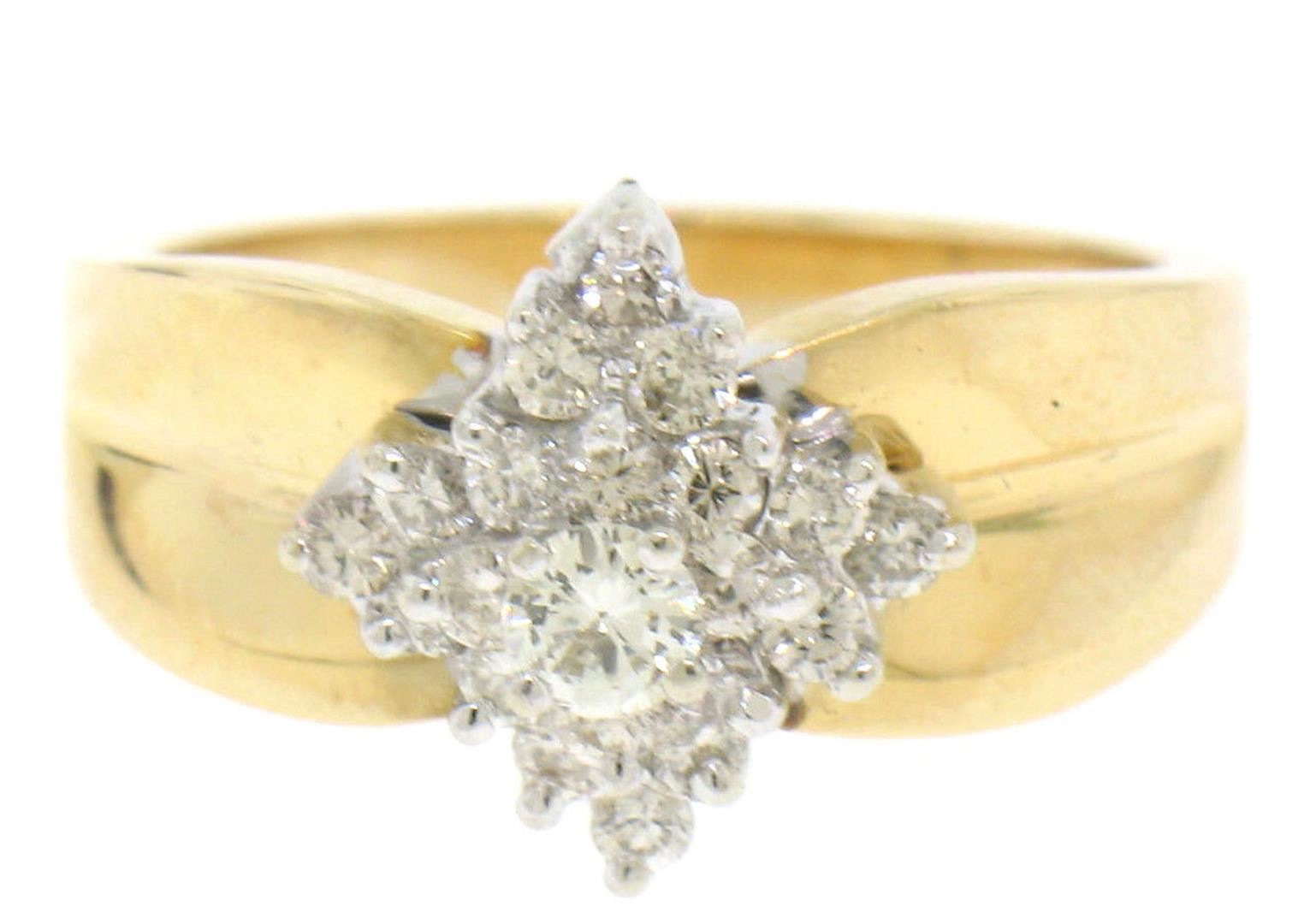 An estate solid 14k yellow gold cluster ring, featuring 21 round brilliant cut natural diamonds (G/H - VS2/SI1 ; 0.50ctw). The ring is size 6.25, weighs a total of 5.90 grams, and measures 11.66mm wide.