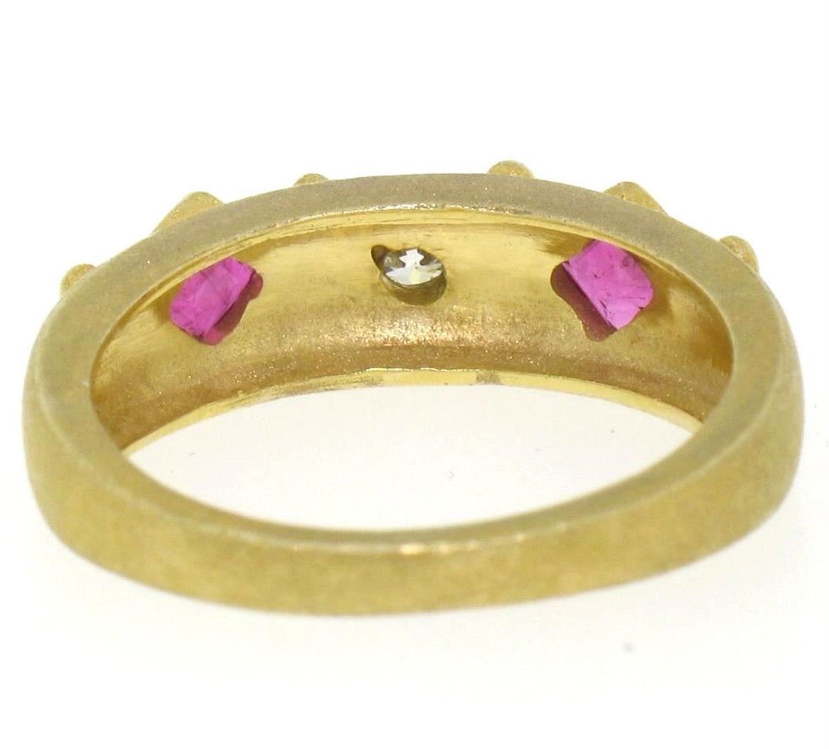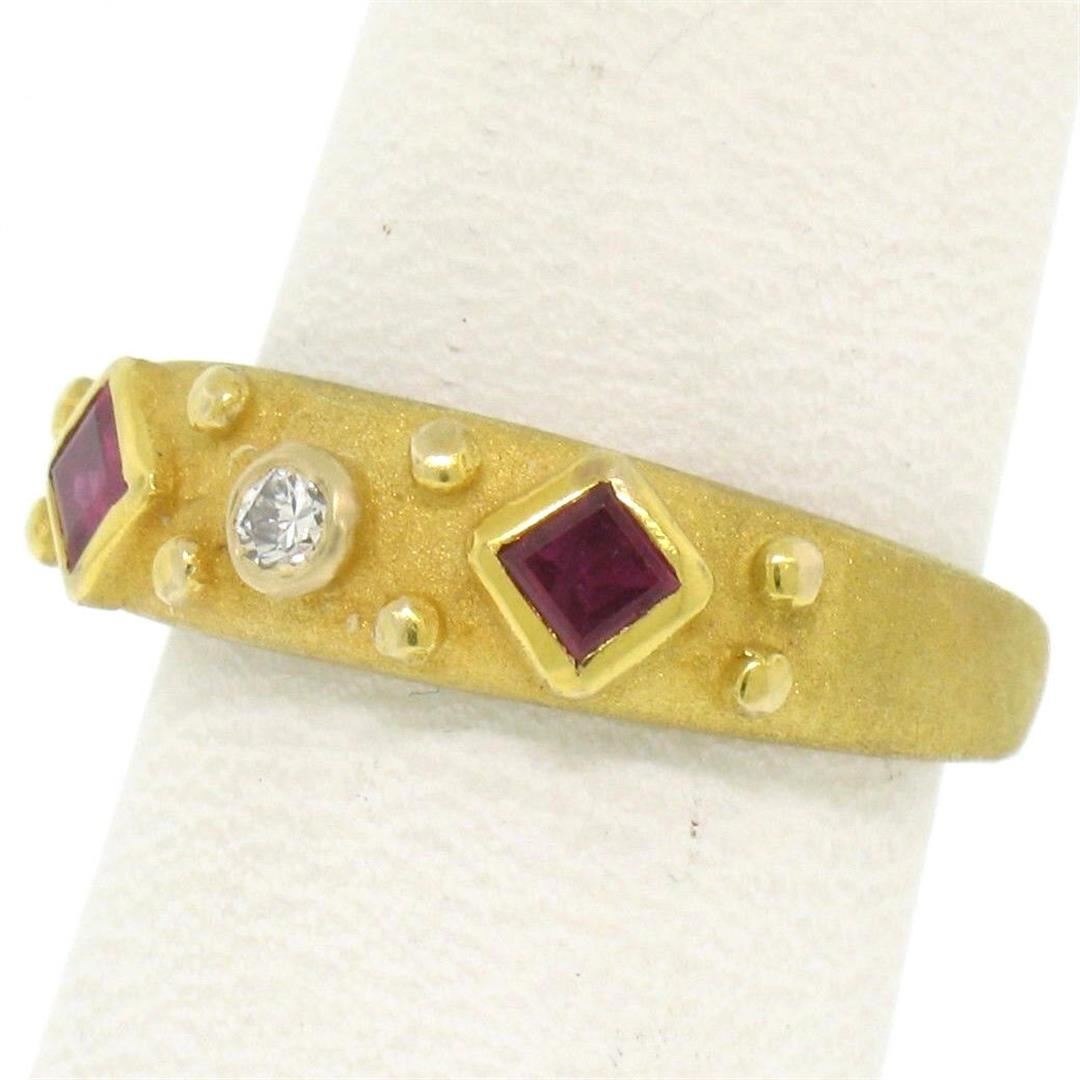 14k Yellow Gold 0.55ctw Square Blood Ruby Round Diamond Sandblasted Band Ring. Please see photos and description for all available information. An estate solid 14k yellow gold sandblasted band ring, featuring 2 square step cut natural rubies (0.50ctw), an