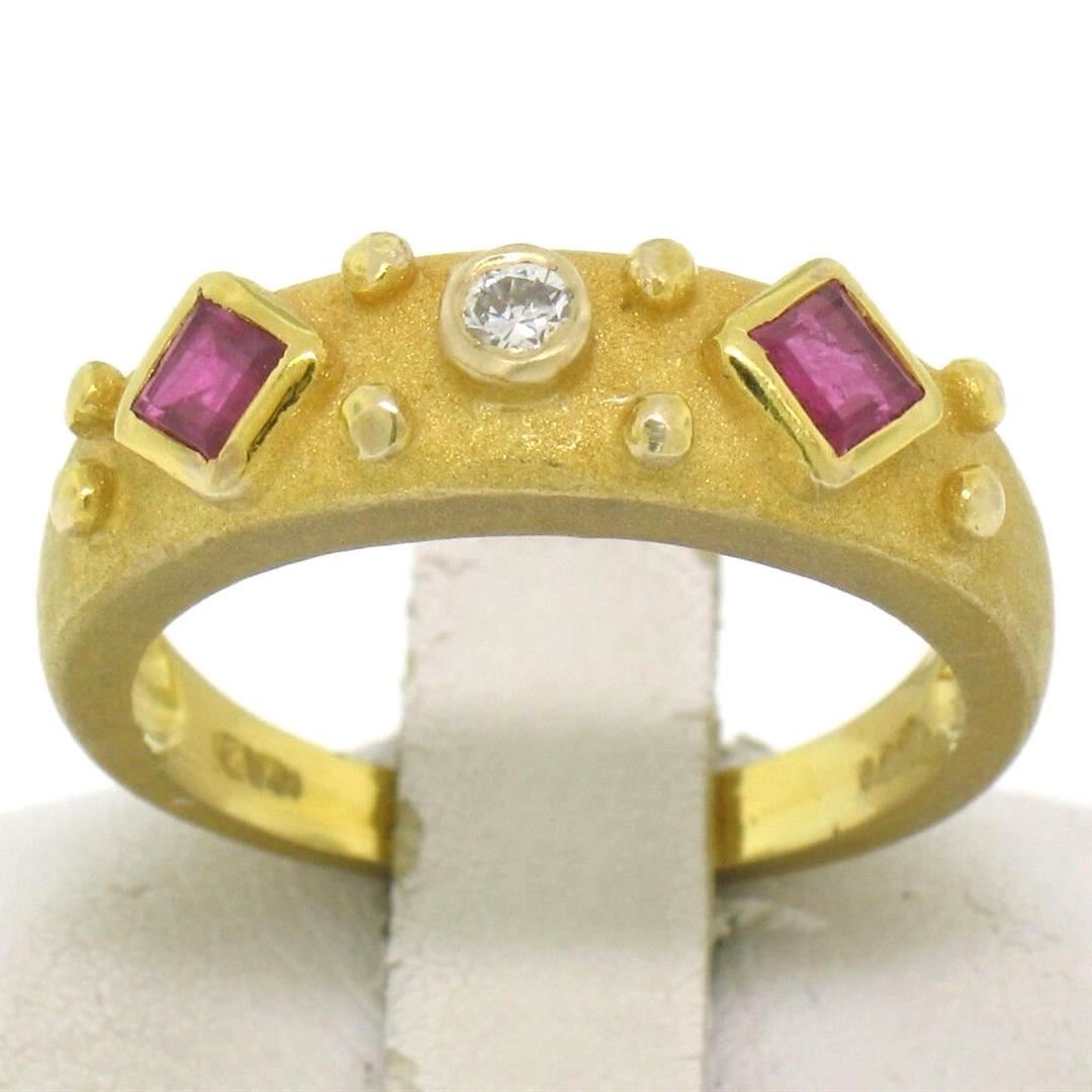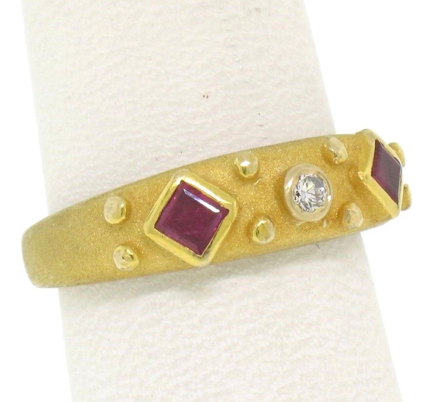 14k Yellow Gold 0.55ctw Square Blood Ruby Round Diamond Sandblasted Band Ring. Please see photos and description for all available information. An estate solid 14k yellow gold sandblasted band ring, featuring 2 square step cut natural rubies (0.50ctw), and 1 round brilliant cut natural diamond (F- VS1; 0.05ctw). The ring is size 5.5, weighs a total of 3.7 grams, and measures 5.5mm wide.