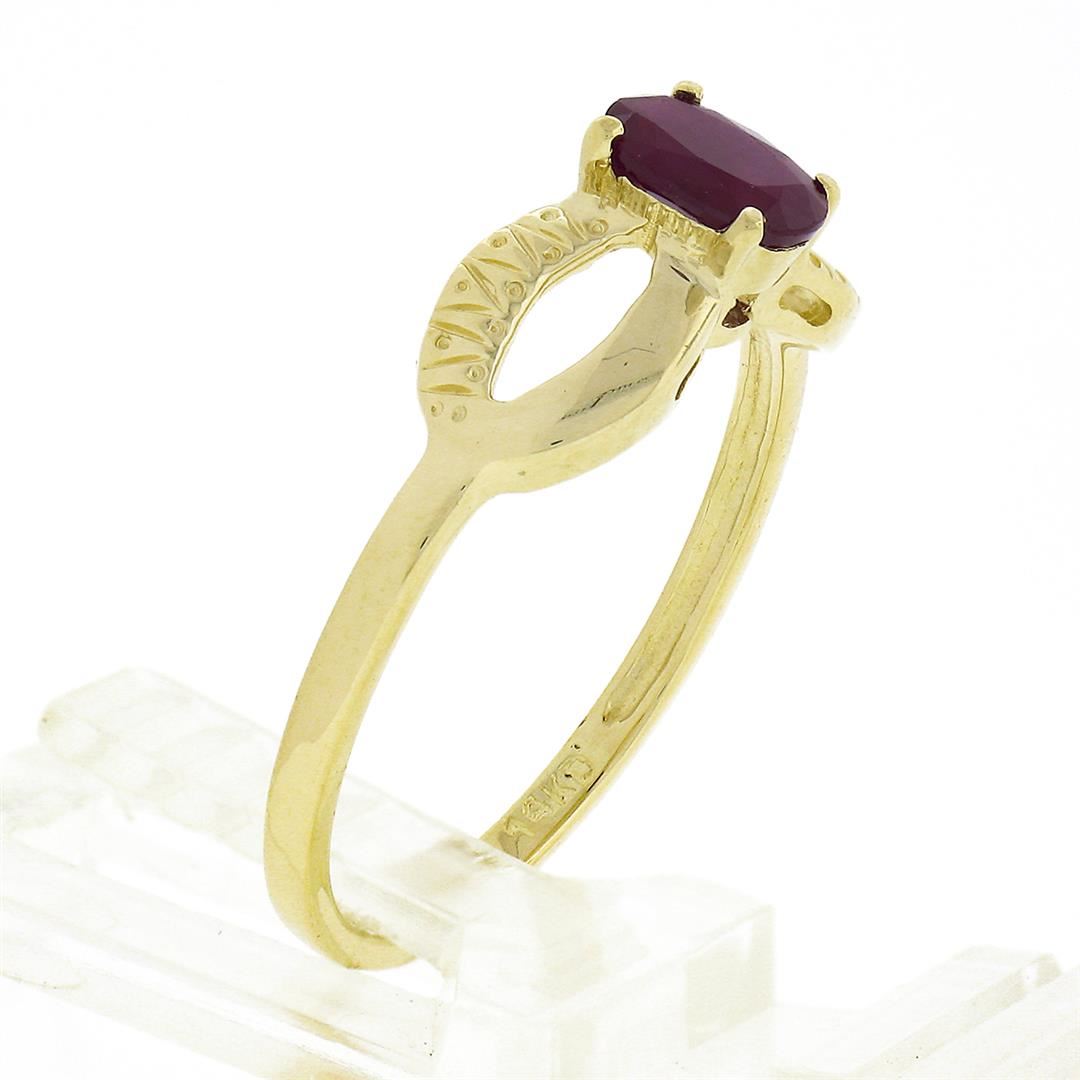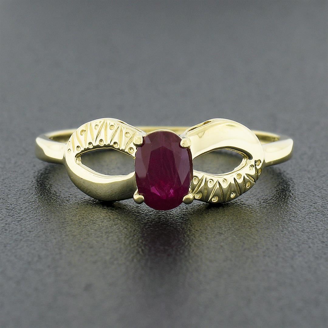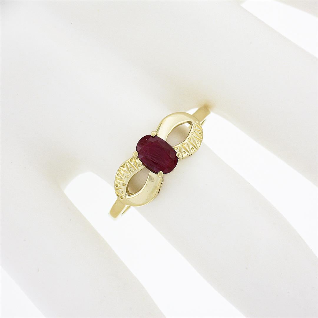 A solid 14k yellow gold open work solitaire ring, with 1 oval cut natural ruby (6.15x4.21mm - 0.70ct). The ring is size 9.0, weighs a total of 2.20 grams, and measures 6.70mm wide.