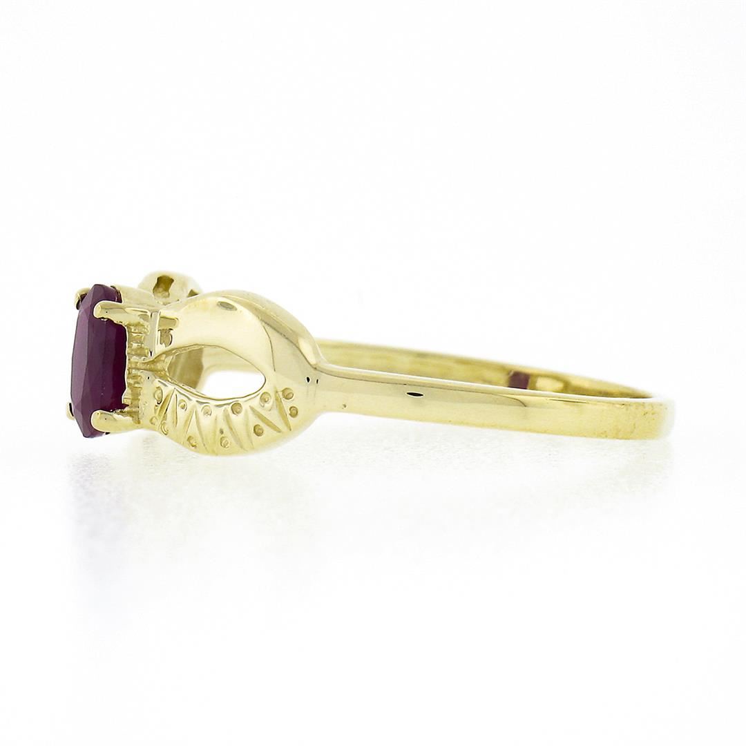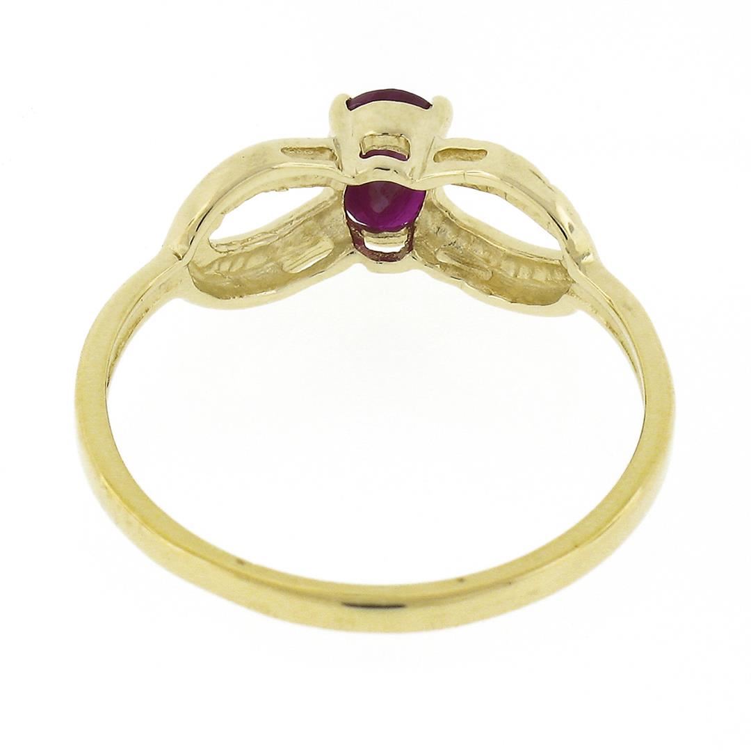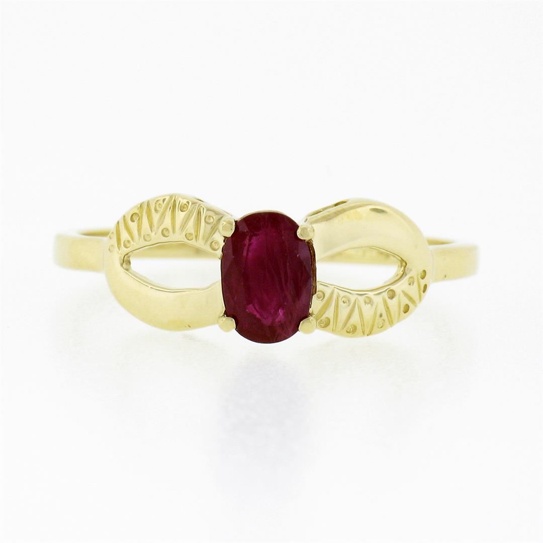 A solid 14k yellow gold open work solitaire ring, with 1 oval cut natural ruby (6.15x4.21mm - 0.70ct). The ring is size 9.0, weighs a total of 2.20 grams, and measures 6.70mm wide.