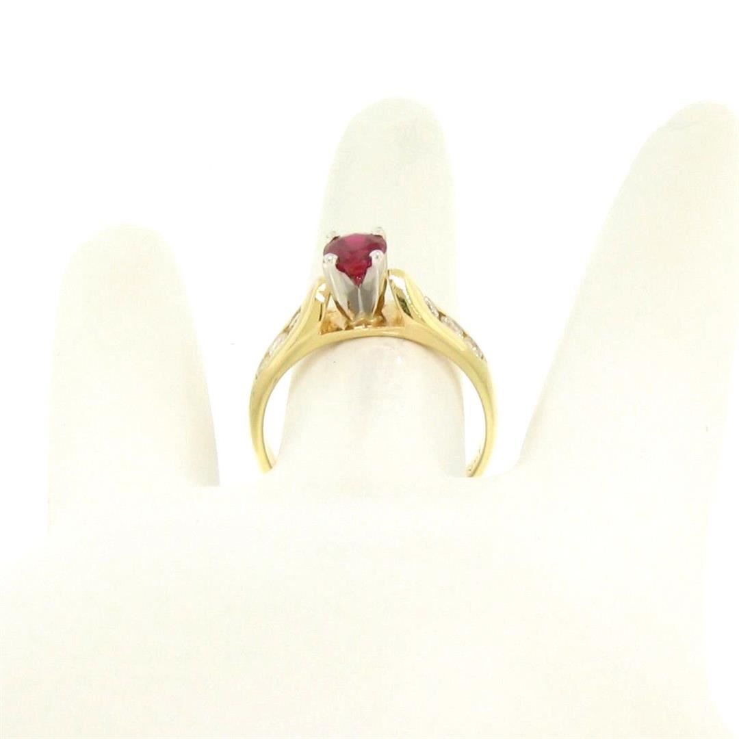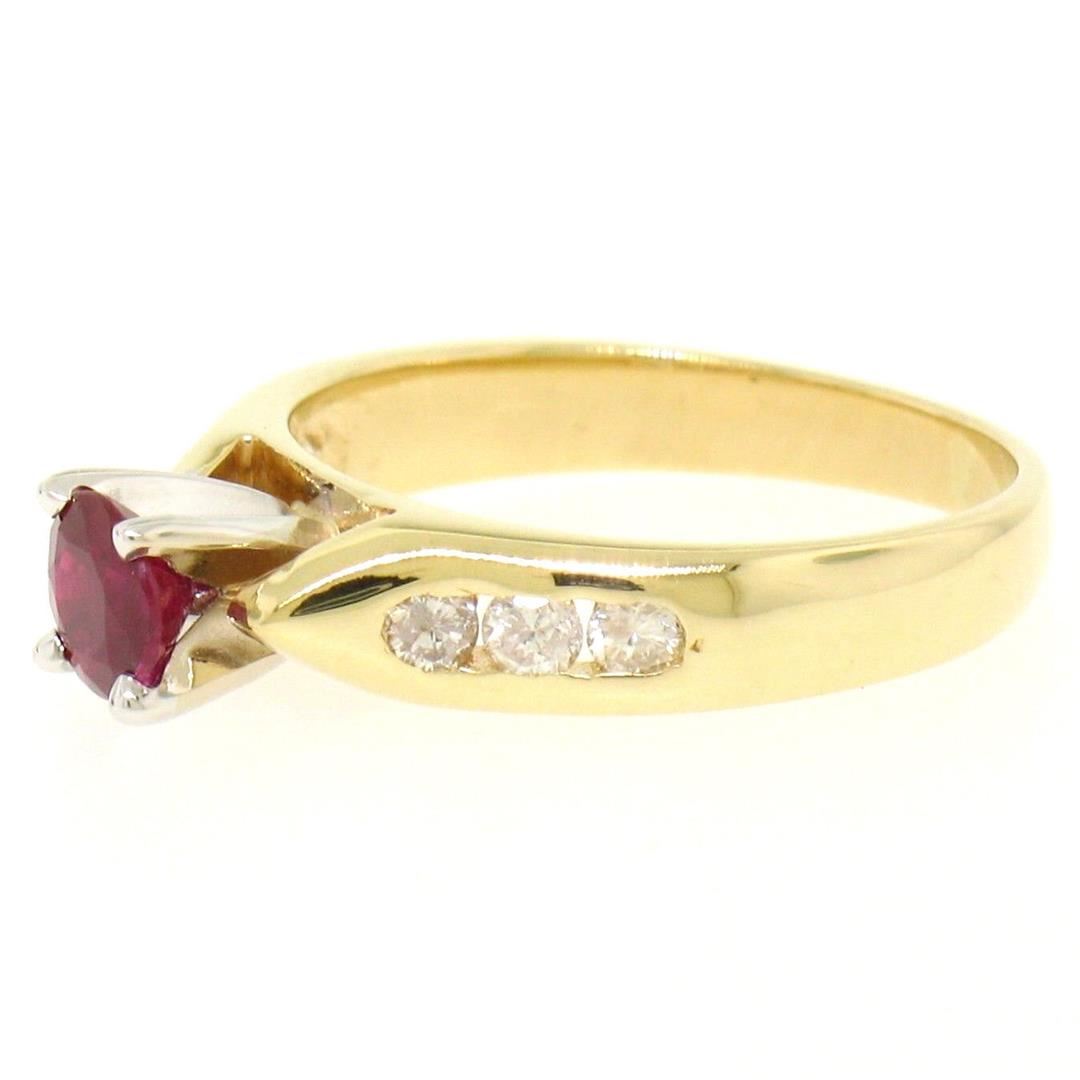 14k Yellow Gold 0.77ctw Round Ruby Solitaire Engagement Ring w/ Diamond Accents. Please see photos and description for all available information. An estate solid 14k yellow and white gold solitaire ring, with 1 round brilliant cut natural ruby (0.59ct), accented with 6 round brilliant cut natural diamonds (G/H- VS2/SI2; 0.18ctw). The ring is size 5.5, weighs a total of 3.1 grams, and measures 4.75mm wide.