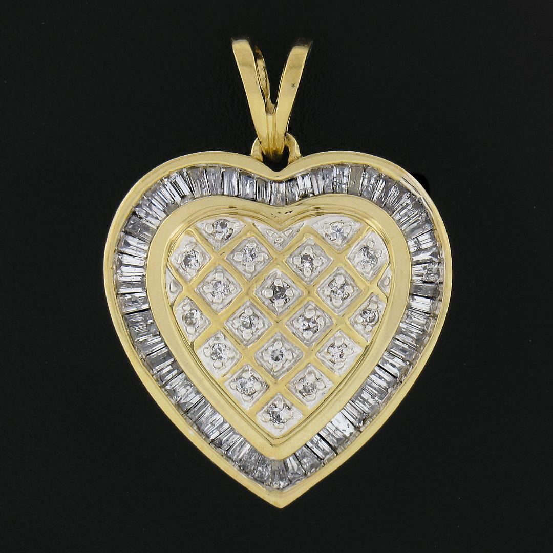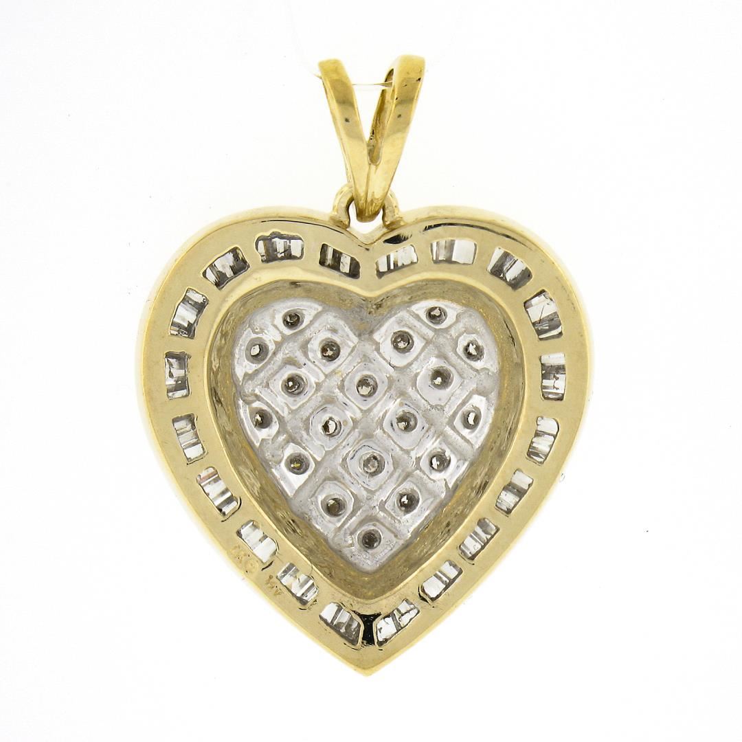 A solid 14k yellow gold heart pendant. with 19 round brilliant cut & numerous of baguette cut natural genuine diamonds (G/H - SI2/I2 ; 0.80ctw). The pendant weighs a total of 5.67 grams, measures 27.90x20.70mm including the bail, and the inside of the bail measures 4.9x4mm.