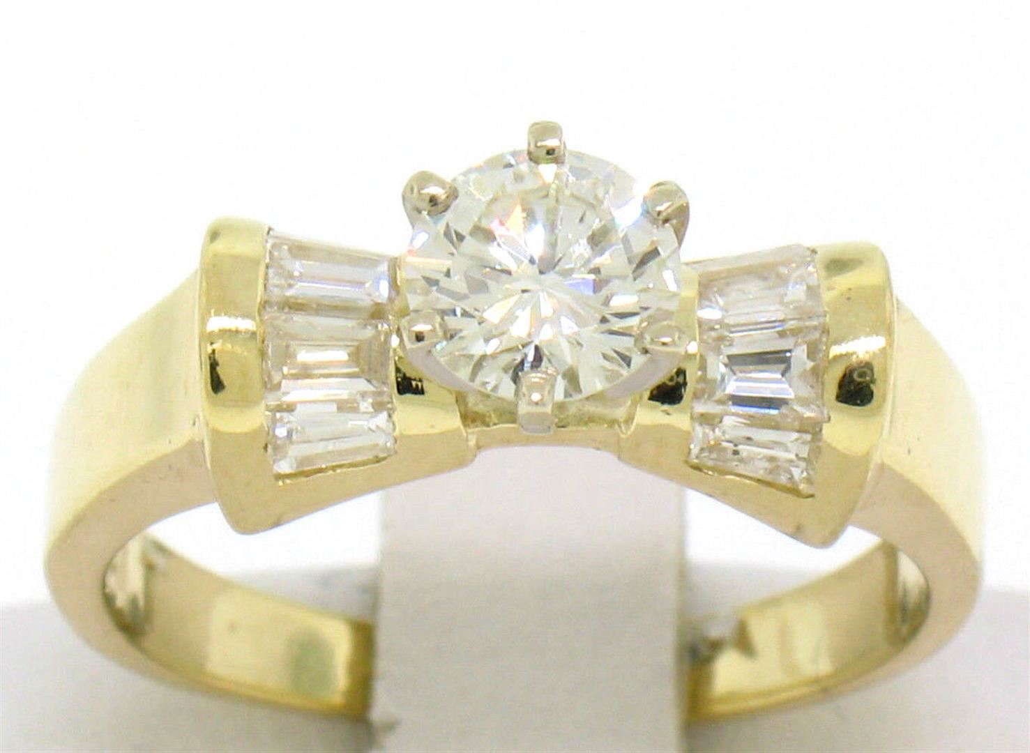 A new soldi 14k yellow gold solitaire ring, with 1 round brilliant cut natural diamond (G - VS1 ; 0.51ct), accented with 8 baguette cut natural diamonds (G - VS1 ; 0.40ctw). The ring is size 6.0, weighs a total of 3.9 grams, and measures 6.16mm wide.