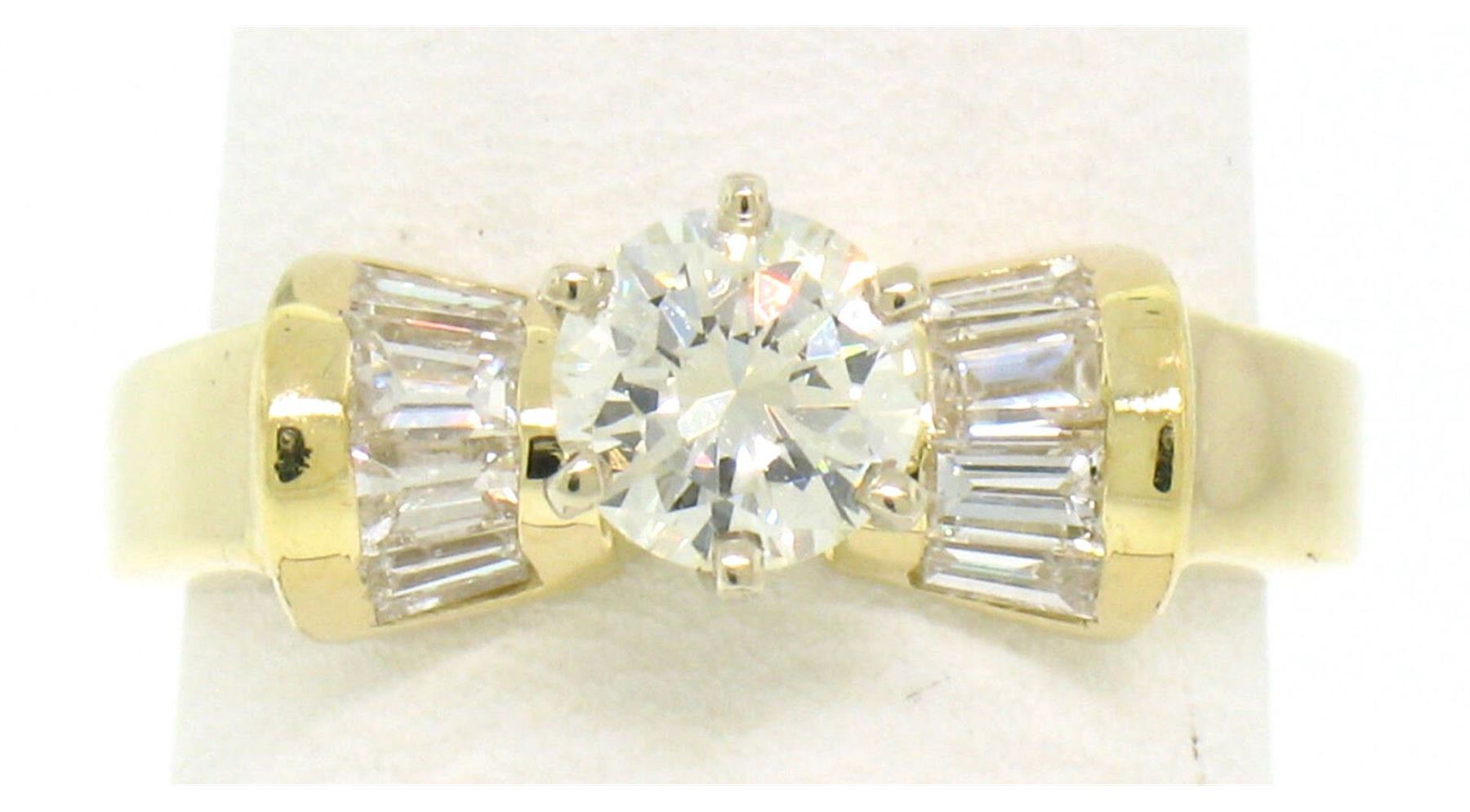 A new soldi 14k yellow gold solitaire ring, with 1 round brilliant cut natural diamond (G - VS1 ; 0.51ct), accented with 8 baguette cut natural diamonds (G - VS1 ; 0.40ctw). The ring is size 6.0, weighs a total of 3.9 grams, and measures 6.16mm wide.