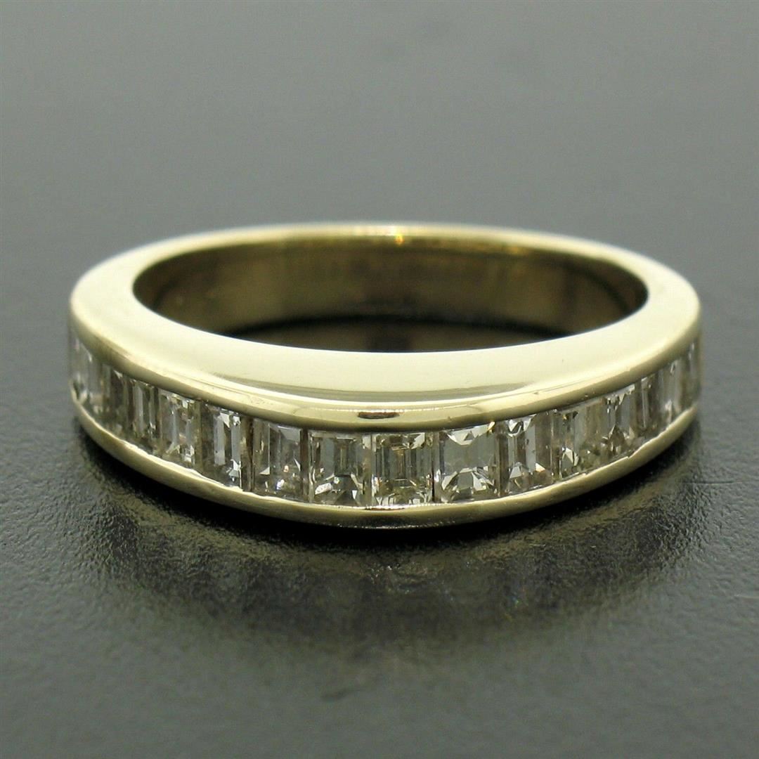 A like new 14k yellow gold domed band ring with 1.0ctw of channel set baguette cut diamonds (H - VS1). The ring is a size 5, weighs a total of 3.90 grams, and is 4.20mm wide.