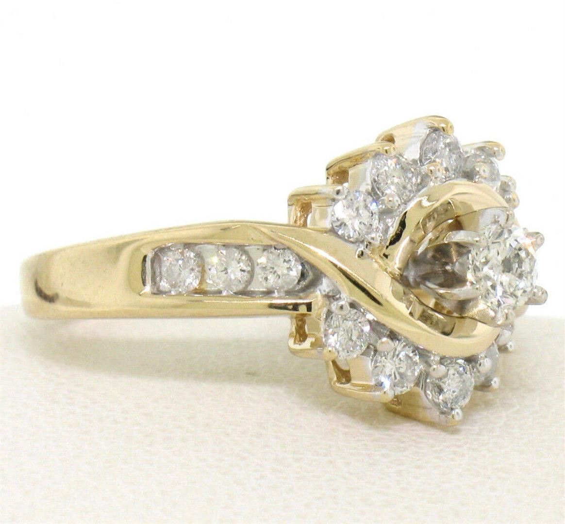 14k Yellow Gold 1.00ctw Keepsake Channel Round Diamond Cocktail Engagement Ring. Please see photos and description for all available information. An estate solid 14k yellow gold engagement ring by Keepsake, featuring 17 round brilliant cut natural diamonds (G - I1; 1.00ctw). The ring is size 7.0, weighs a total of 5.1 grams, and measures 13.0mm wide.