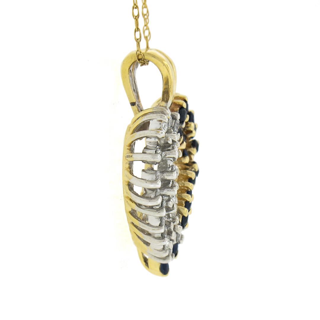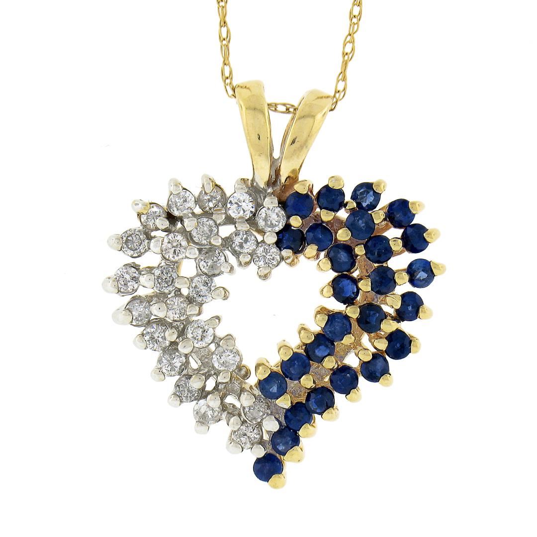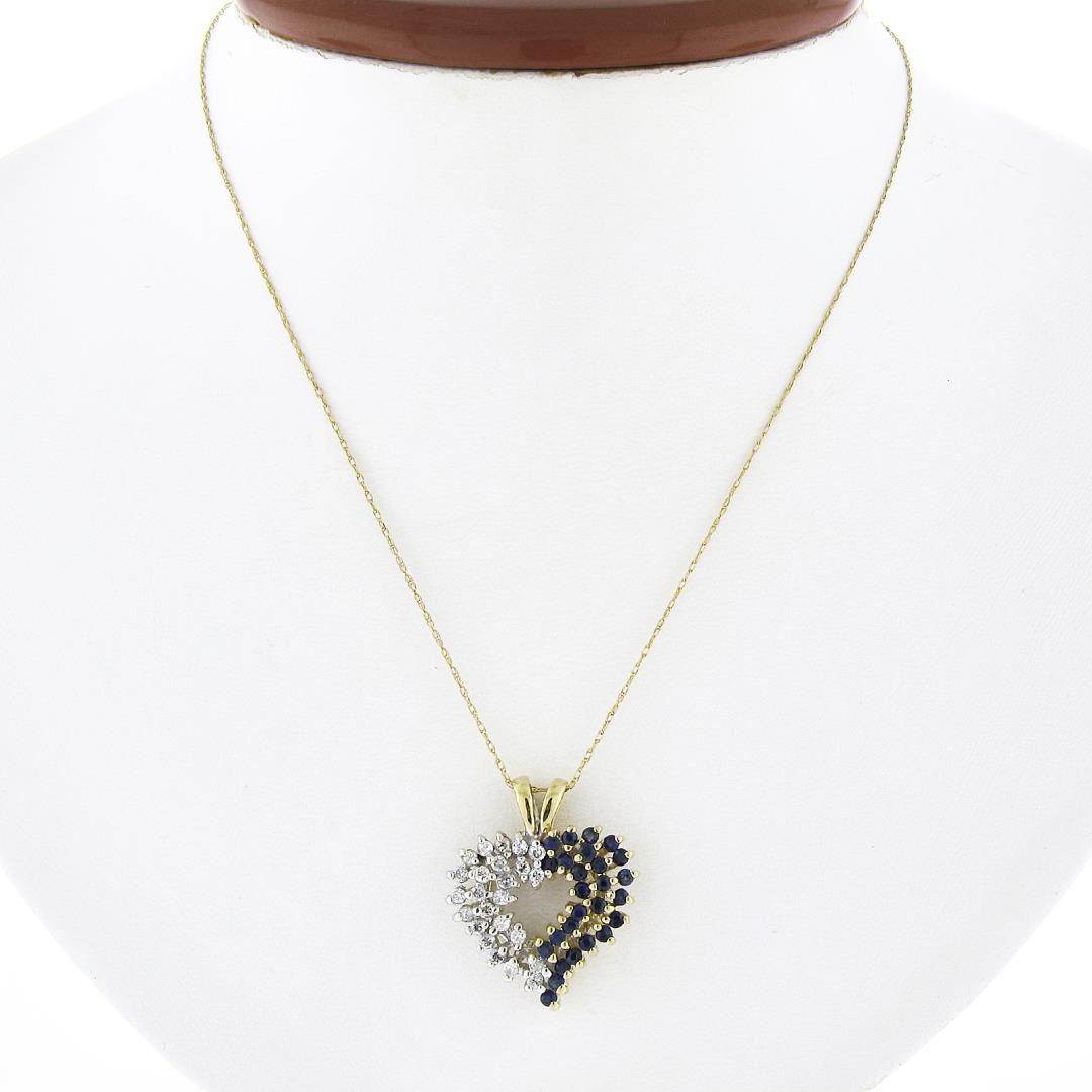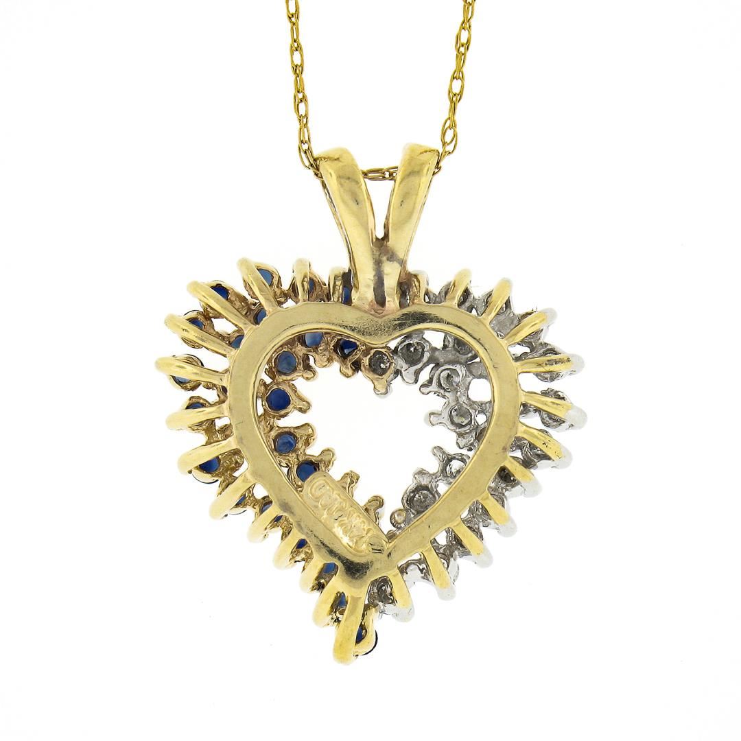 A solid 14k yellow gold heart pendant necklace, with 24 round brilliant cut natural diamonds (G/I - I1/I2 ; 0.48ctw), and 26 round brilliant cut natural sapphires (0.60ctw). 21 inch rope link chain, 4.70 grams total weight, pendant measures 20x21.3mm.