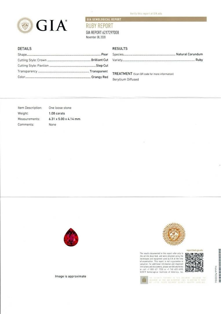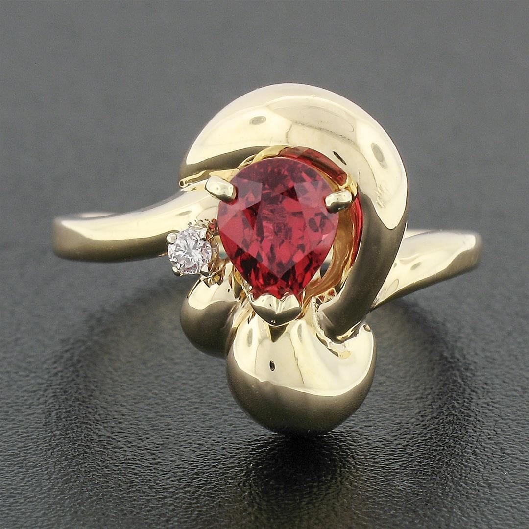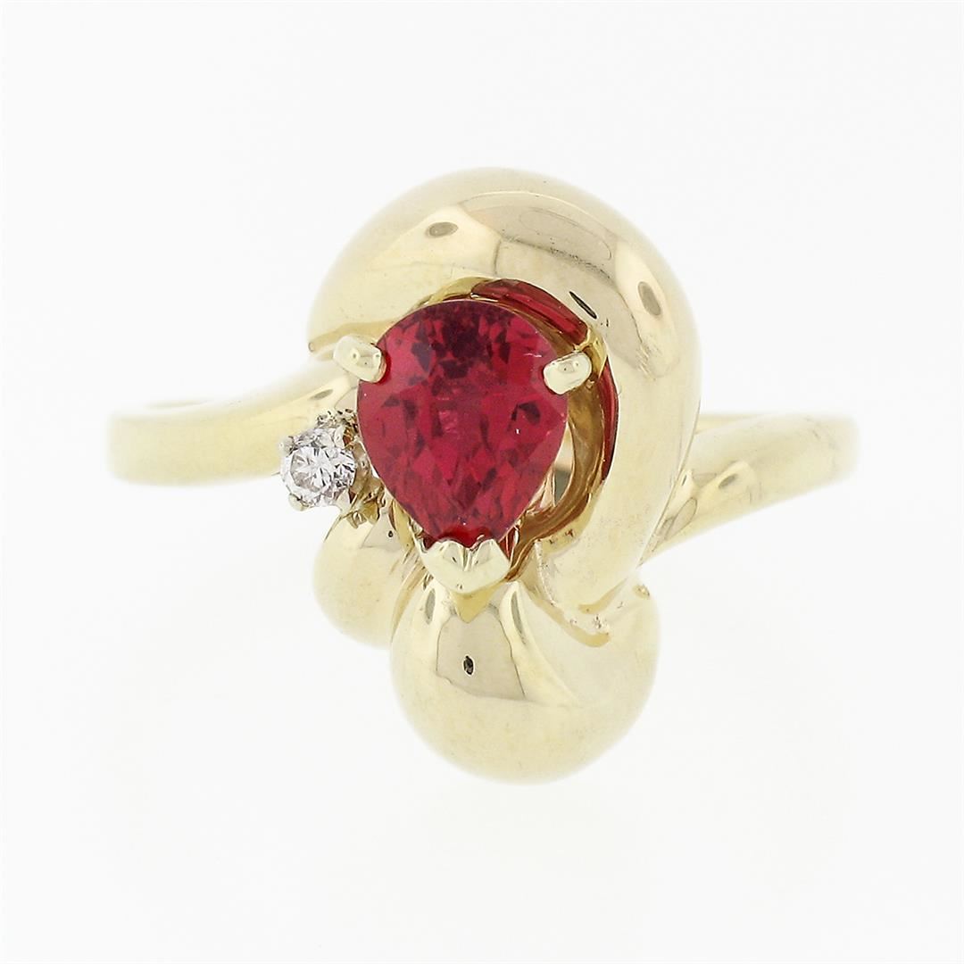 A solid 14k yellow gold ring , with 1 Gia certified Pear cut natural ruby (1.08ct), and 1 round brilliant cut natural diamond (G- VS2; 0.03ct). The ring is size 6.5, weighs a total of 4.51 grams, and measures 14.92mm wide.