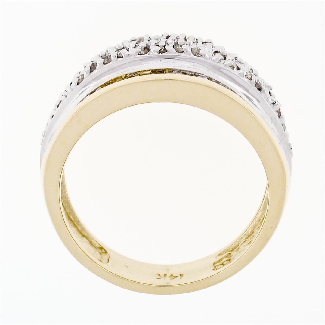 A solid 14k yellow gold 3 row band ring with 34 round brilliant cut natural diamonds (H/I - SI1 to I1; 0.34ctw) and 44 tapered baguette cut natural diamonds (H/I - SI1 to I1; 1.00ctw). The ring is size 7.0 weighs a total of 7.30 grams, and measures 11.53mm wide.